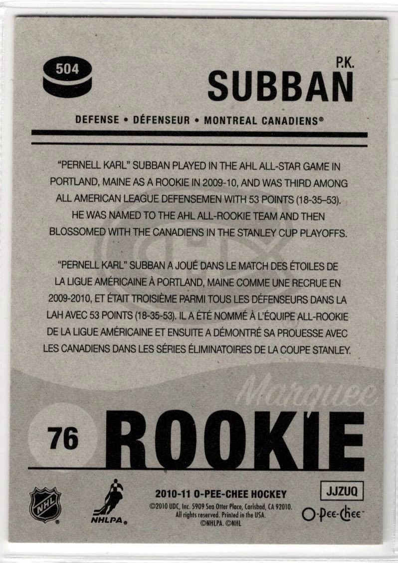 P.K. Subban 2010-11 O-Pee-Chee Marquee Rookie Card #504