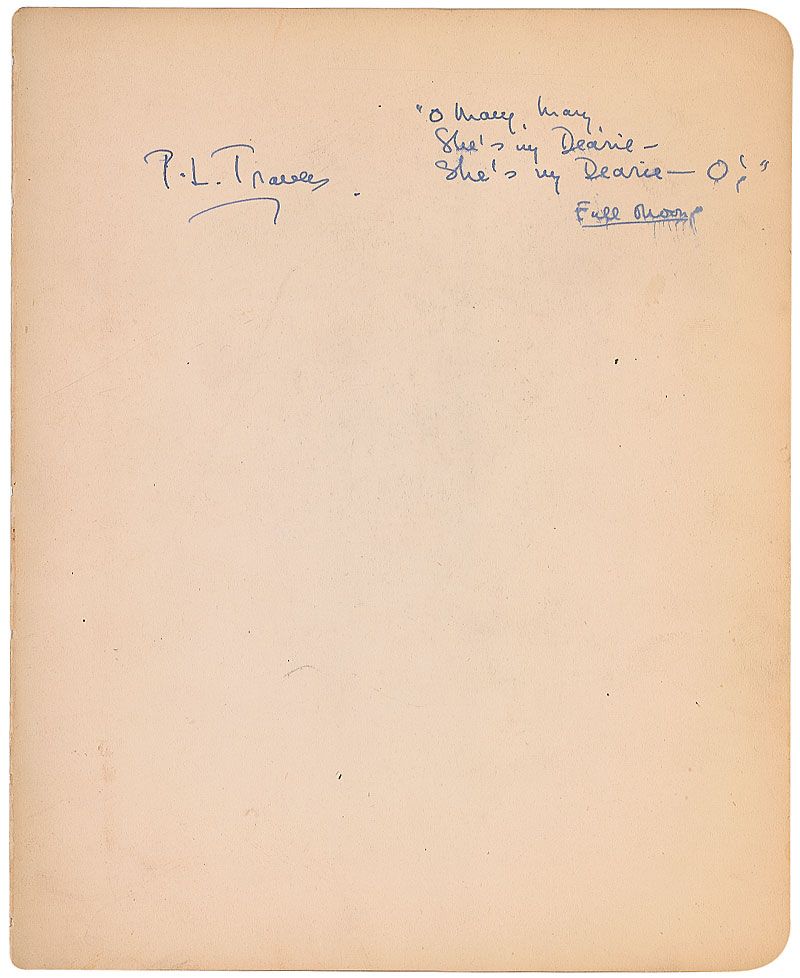 Australian novelist, actress, and journalist best remembered for writing Mary Poppins (1899–1996). Vintage AQS on an off-white 6.25 x 7.75 sheet. Travers pens a quote from Mary Poppins. In full: “O Mary, Mary / She’s my Dearie— / She’s my Dearie—O,” identifying the chapter it is from as “Full Moon.” Signed to the left of the quote in fountain pen. In fine condition.