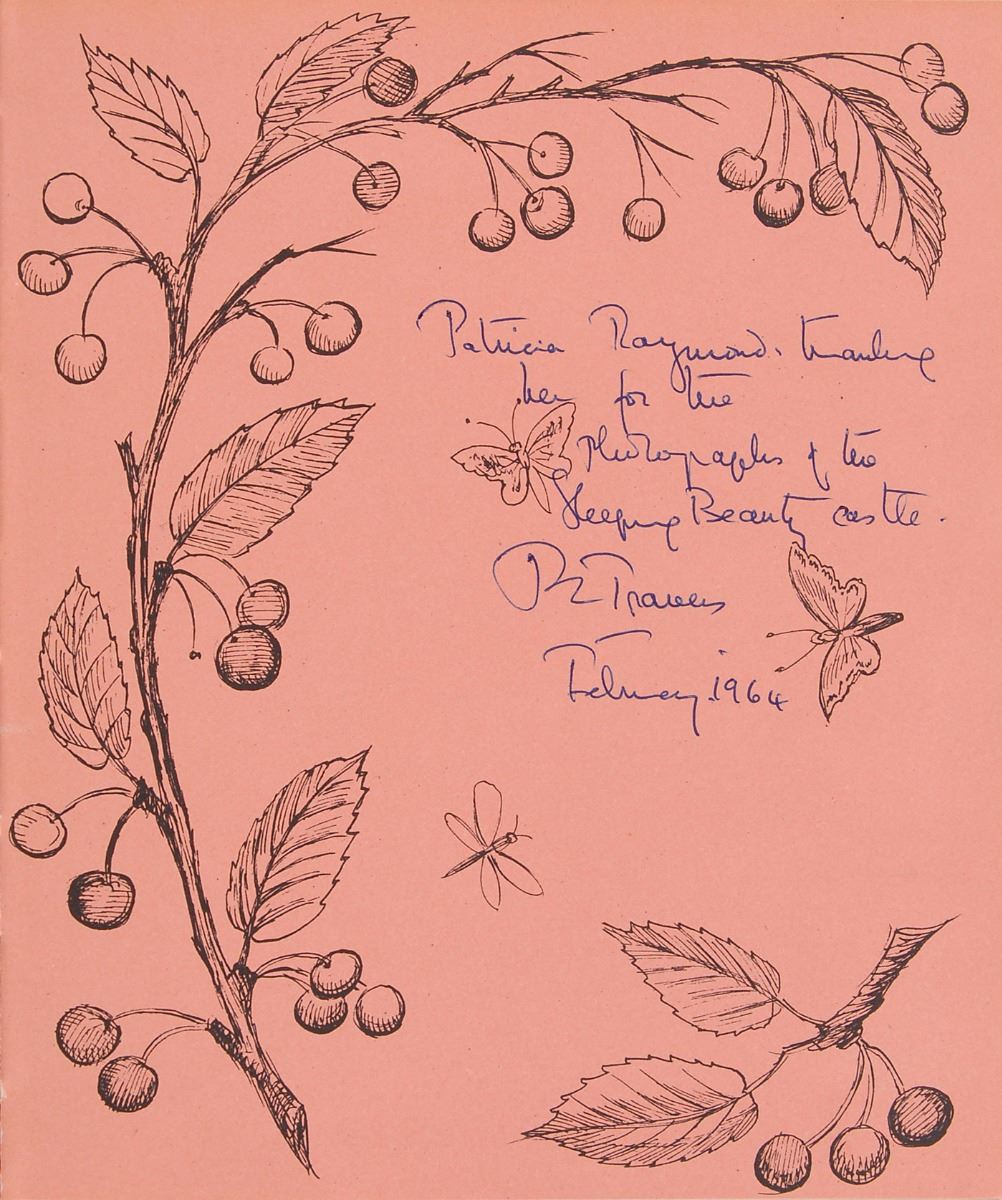 Signed book: Mary Poppins from A to Z. First edition. London: Collins, 1963. Hardcover, 6 x 7.75. Signed and inscribed on the first free end page in blue ballpoint, “Patricia Raymond, thanking her for the photographs of the Sleeping Beauty castle. P. L. Travers, February 1964.” In fine condition.