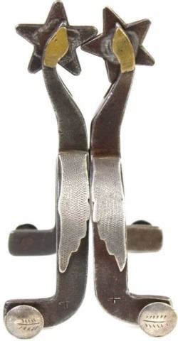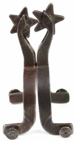 P.M. Kelly gooseneck spurssingle mounted with "X" stamp, 9/16" wide heel bands, 2 1/2" shanks, and original 1 1/2", 5 point rowels. From Dillman Ash collection. Est. 400-650