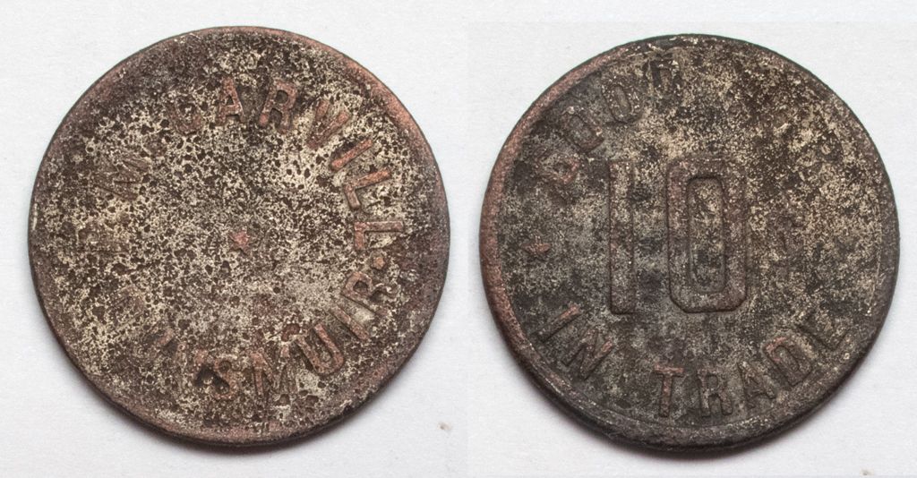 Brass token that reads GOOD FOR 10 CENTS IN TRADE. It’s from P. McCarvill in Dunsmuir, CA. Condition is a little rough, but it is a good buy and unique.City: DunsmuirCounty: Siskiyou State: CADate: