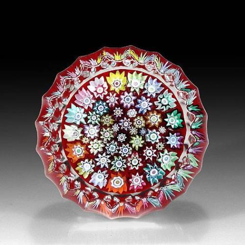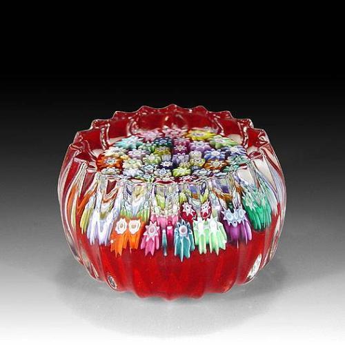 P. McD Glass Studio close packed millefiori miniature paperweight, with colorful complex canes on opaque red ground. Ribbed sides. Diameter 1 3/4".