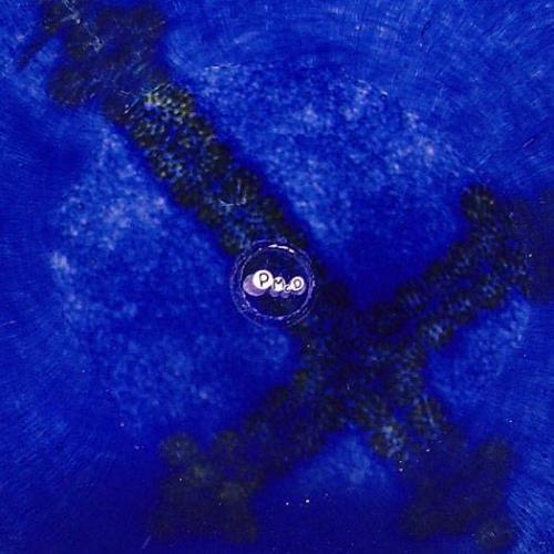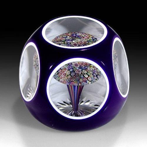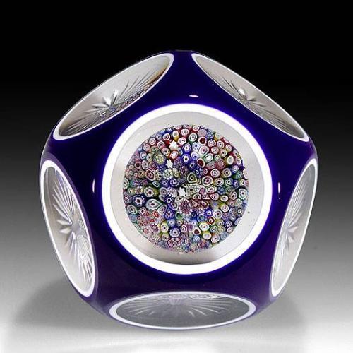 P. McD Glass Studio "Millefiori Cross" paperweight. A golden-yellow millefiori cross, is centered on cobalt blue ground, bordered by a garland of blue complex canes. "PMcD" signature cane. Diameter 2 5/8".