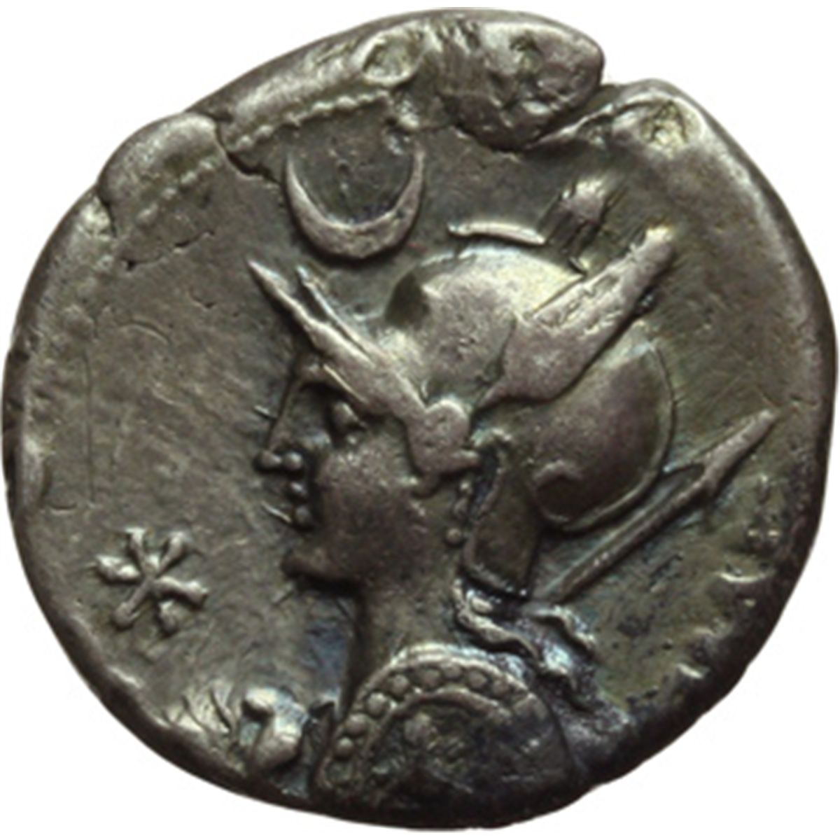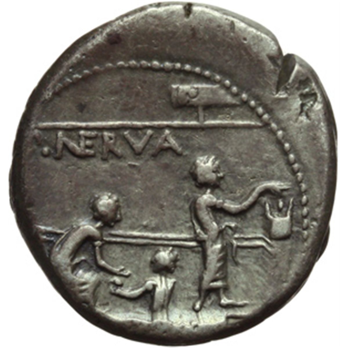 Repubblica Romana. P. Nerva. Denario, 113-112 a.C. D/ Busto di Roma a sinistra, armata di lancia e scudo. Davanti, stella. Sopra, crescente. Dietro, ROMA. R/ P. NERVA. Tre cittadini votano in un comitium. Sopra, tabella con lettera P. Cr.292/1. B.(Licinia)7. AG. g. 3.84 mm. 17.50 R. Di qualitv† eccellente per il tipo. qSPL.