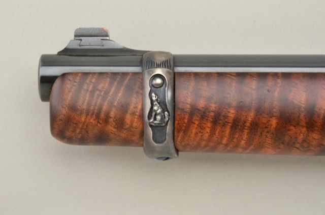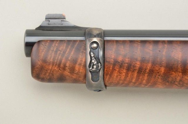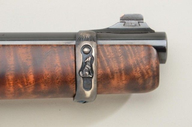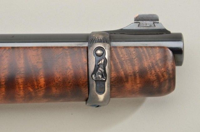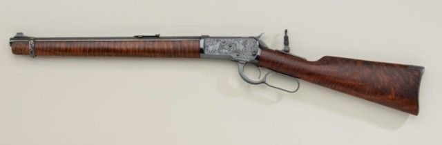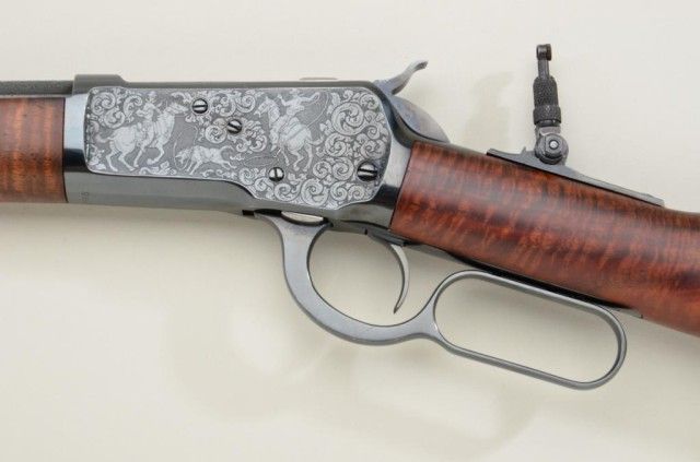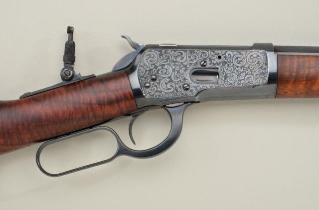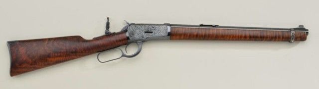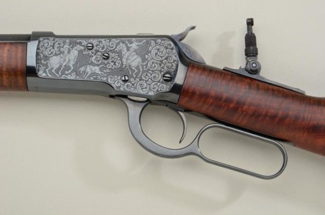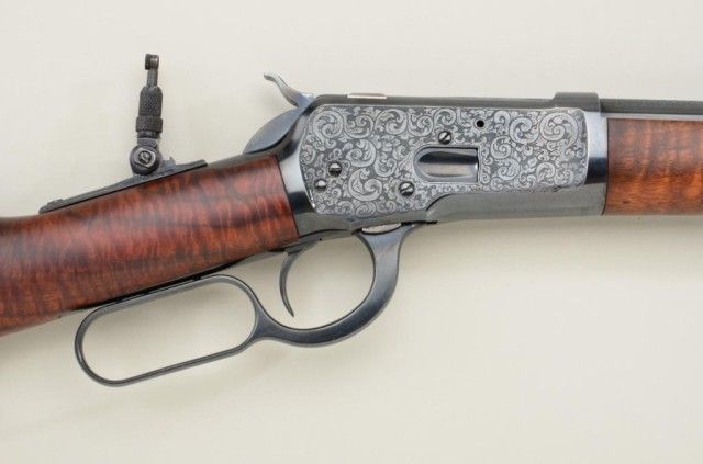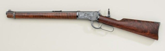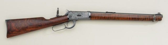 P.O. Ackley customized Winchester Model 1892 lever action short rifle, .357 Magnum cal., 16” round barrel, blue finish, scroll engraving with western scene on left side of receiver showing cowboys roping a wolf,custom wood stocks and front barrel band, #345906 with Marble’s adjustable tang sight. This customized gun is in overall fine condition showing engraving on the receiver, barrel at breech and butt plate, fine re-blue finish, fine bore and action; wood stocks show beautiful flame graining and the fore stock extends the full length of the barrel; fine workmanship by a noted artisan. Est.: $1,250-$2,500.