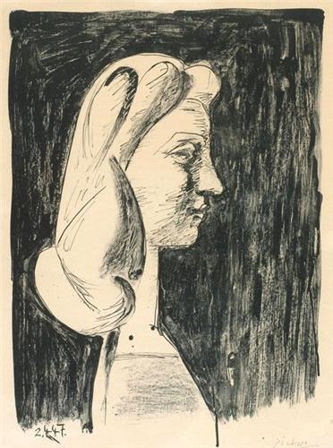 It was in 1946 and 1947 that Picasso started to make the series of studies of Francoise which are amongst his most beautiful and inventive works in lithography. His relationship with Francoise at this period was one of calm love and family life, and this relaxed atmosphere can certainly be strongly felt in the poetry and lyricism of these wonderful portrait studies. The invention with which Picasso was approaching his lithography was also stimulated by his life style, and in the portraits can be seen some of his most inspired ideas. For Grand Profil, above, Picasso used a soft rubbed crayon line, pen-work and brush wash, the combination giving a sense of lightness and movement to the whole surface of the image. The elongation of the proportions and the expressive contour-line created by the perfect profile pose are both used to emphasise the sense of quiet poetry and admiration in the portrait