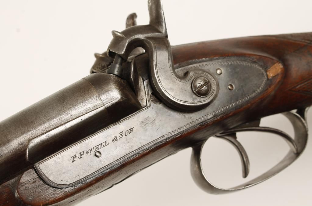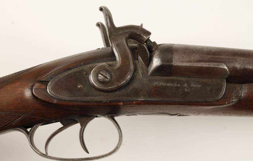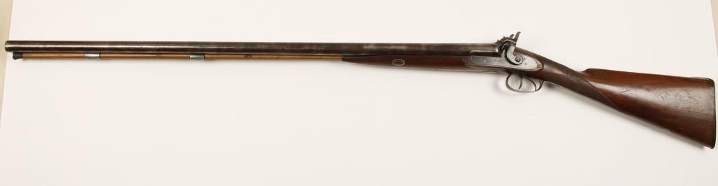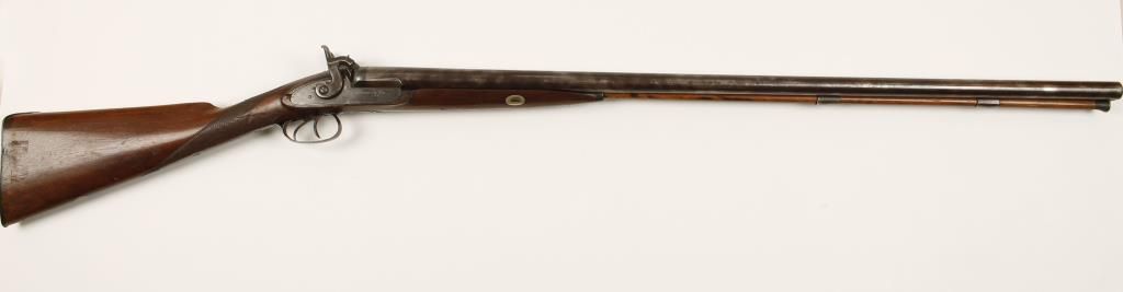 Muzzleloading percussion shotgun with damascus barrels. Rib is marked "London Fine Twist". Two long cracks on the right side of the wrist. Bore appear to be in good condition. Condition is fair. *Antique Firearm*