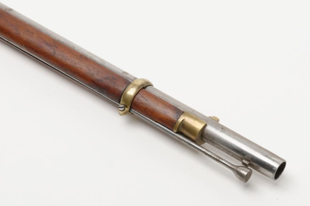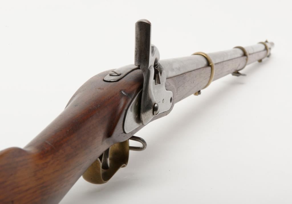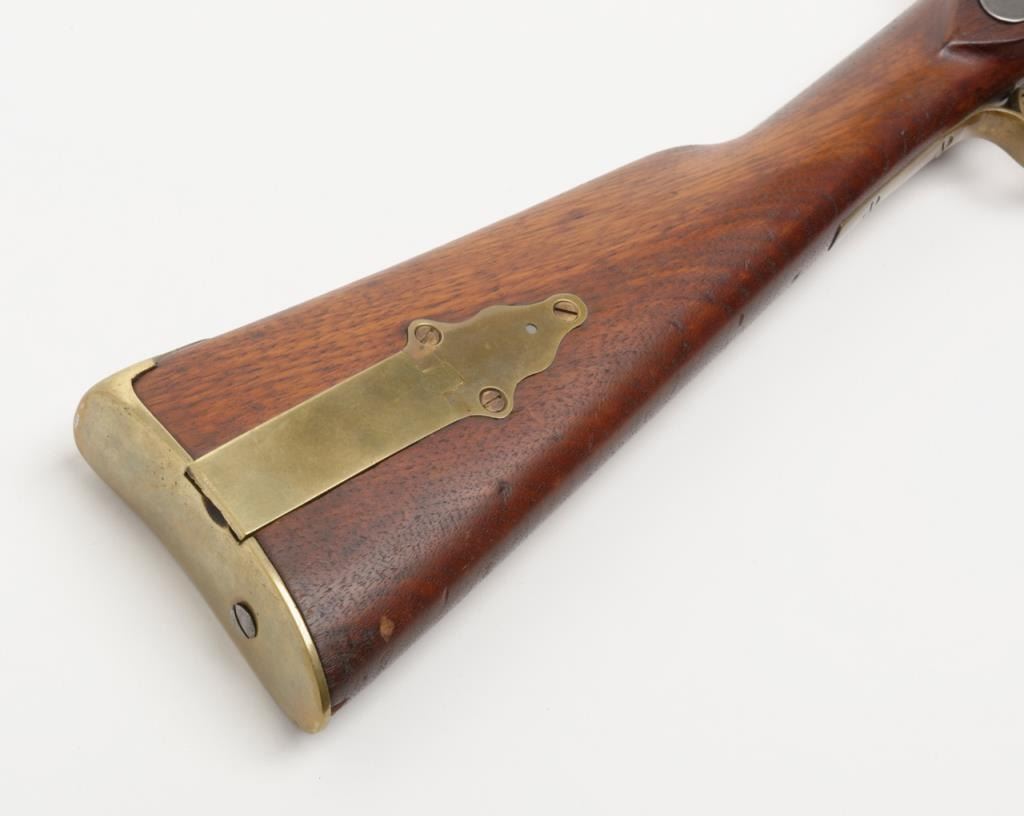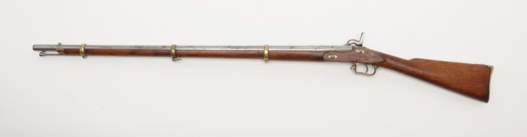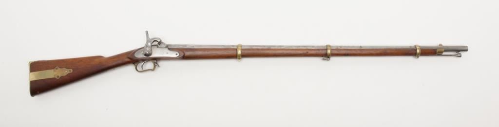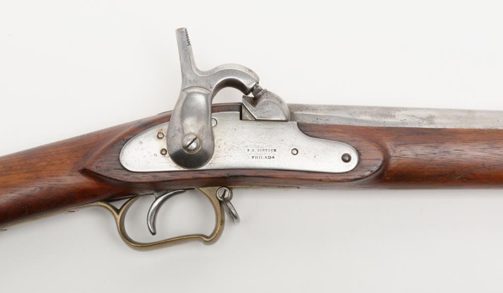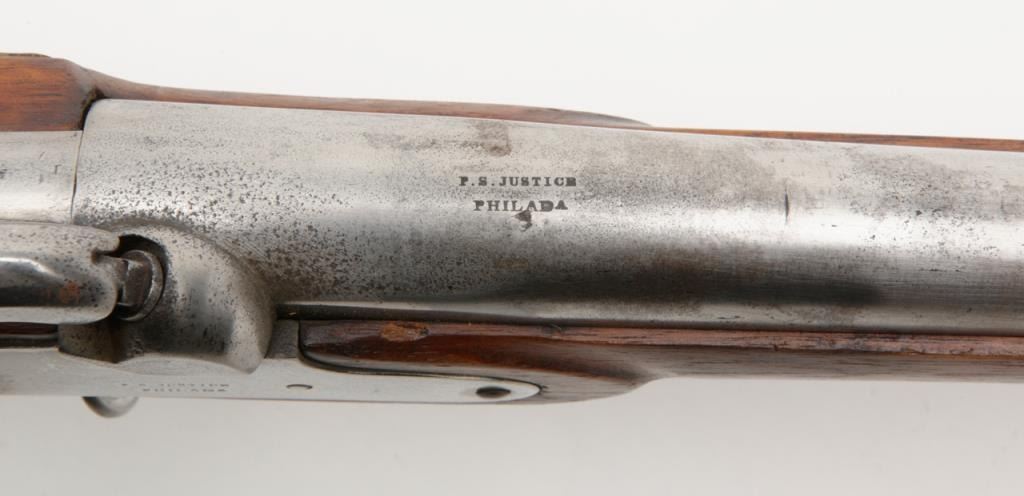 P. S. Justice early Civil War period rifled musket in .58 caliber showing brass mountings and patch box with unique shaped trigger guard0(Refer Flayderman 9B-026). The metal surfaces show some light cleaning withbeginning minor rust and some light pitting around the area of the nipple and bolster. The lock is well marked as is the rear of the barrel. The stock is good with light cleaning, some small dings, mars, scratchesand a couple of small losses along the ramrod channel. A correct period style ramrod is included. The lock works well and the bore shows good rifling. Approximately 2500 estimated to have been produced and themajority were issued to Pennsylvania volunteer units in 1861 at the beginning of the Civil War. William A. Gary collection consigned by his estate. Est.: $1250-$2500