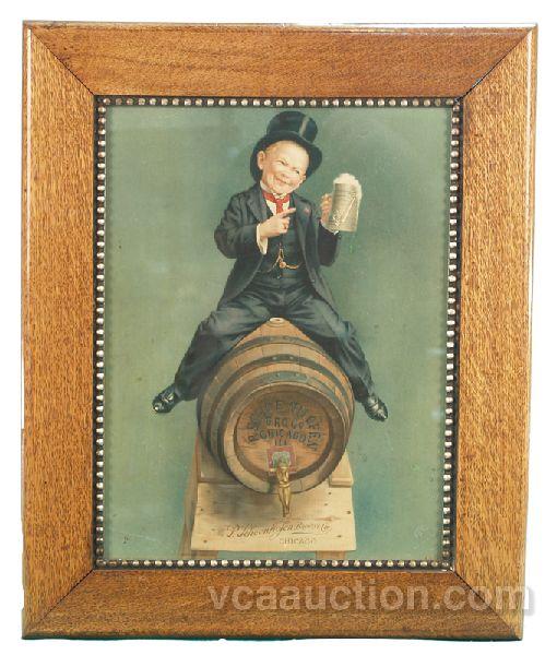 P. Schoenhofen Brewing Co. Chicago Cardboard Sign w/ Tom Thumb drinking a mug of beer sitting on a barrell, in frame - 20" x 24"