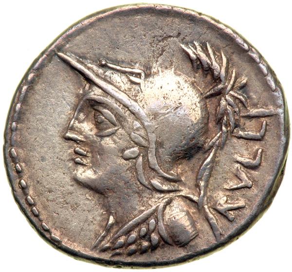 P. Servilius M.f. Rullus, moneyer. AR Denarius minted at Rome, c. 100 BC. Bust left of Minerva wearing crested helmet. Reverse: Victory in biga right; in right field, "P". Servilia 14; Cr. 328/1; Syd. 601. Lightly toned, Extremely Fine. .