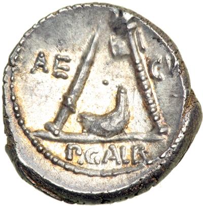 P. Sulpicius Galba, moneyer, 69 BC. AR Denarius. Veiled head right of Vesta; behind, "SC". Reverse: Knife, simpulum and axe (emblems of the pontificate). Cr. 406/1; S-345. Well struck, with beautiful iridescent toning. Mint State.