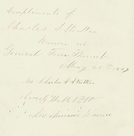 The signatures of four of P. T. Barnum's most famous "little people" executed on a single album sheet, includes: CHARLES S. STRATTON [General Tom Thumb], MRS. CHARLES S. STRATTON, COMMODORE MCNUTT and MINNIE WARREN. Fine.