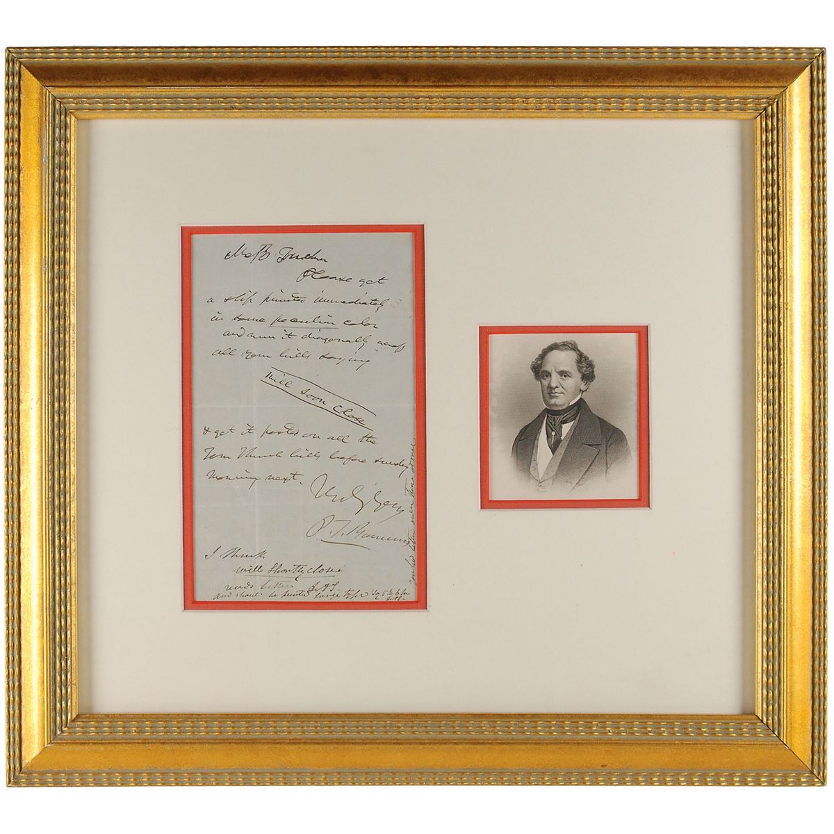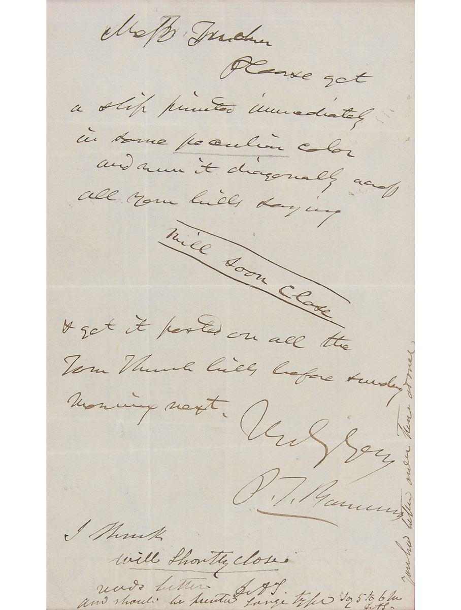ALS, one page, 4.5 x 7.5, no date but circa 1840s. Letter to Mssrs. Tucker, in part: “Please get a slip printed immediately in some peculiar color and run it diagonally across all your bills saying Will Soon Close & get it posted on all the Tom Thumb bills before Sunday morning next.” Barnum adds a handwritten postscript, “I think Will Shortly Close reads better and should be printed large type…you had better order them at once.” Docketed on the reverse, most likely by Barnum, “Mr. Barnum Regent Street.” In fine condition, with intersecting folds. Barnum was a self-made millionaire whose riches and wildly popular circuses were the direct result of his cutting edge advertising tactics. His experimentation with ad content—from deadlines and guarantees to active tense and dramatic visuals—revolutionized the modern marketing practices. Barnum’s specific mention of Tom Thumb here is an uncommon treat.