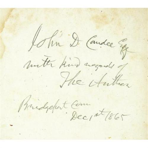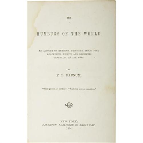 <B>P.T. Barnum. </B></I><B><I>The Humbugs of the World. </B></I></B></I><B>An account of humbugs, delusions, impositions, quackeries, deceits and deceivers generally, in all ages.</B></I> New York: Carleton Publisher, 1866. <BR>First edition. Inscribed by Barnum to his friend and neighbor, John D. Candee, editor of the Bridgeport Standard newspaper and later president of the Bridgeport Library Association: <I>"</B></I>John D. Candee Esq., with kind regards of The Author. Bridgeport, Conn. Dec 1st, 1865<I>."</B></I>Small octavo. 424 pages plus eight pages of publisher's advertisements at end.<BR><BR>Original embossed plum boards, gilt lettering on spine. Light wear to board edges and corners; spine ends worn. Front board has begun to separate from binding; gilt lettering on spine is worn away. Moderate fading to boards and spine. Preliminary pages dampstained and foxed, terminal pages foxed.<BR><BR><b>Shipping:</b> Books & Catalogs (<a target="_blank" href="http://www.heritageauctions.com/common/shipping.php">view shipping information</a>)