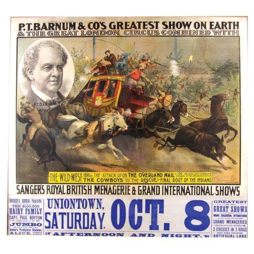 P.T. Barnum and Co. Greatest Show On Earth paper sign. One of the rarest of the most desirable P.T. Barnum posters ever printed featuring the Wild West, The Attack Upon The Overland Mail, Cowboys To The Rescue. The Strobridge litho Co., Cinti, Nev. and London. Framed under glass in period oak frame. Staining and wrinkles on top border otherwise excellent condition. 39 1/2 X 36 1/2 inches.