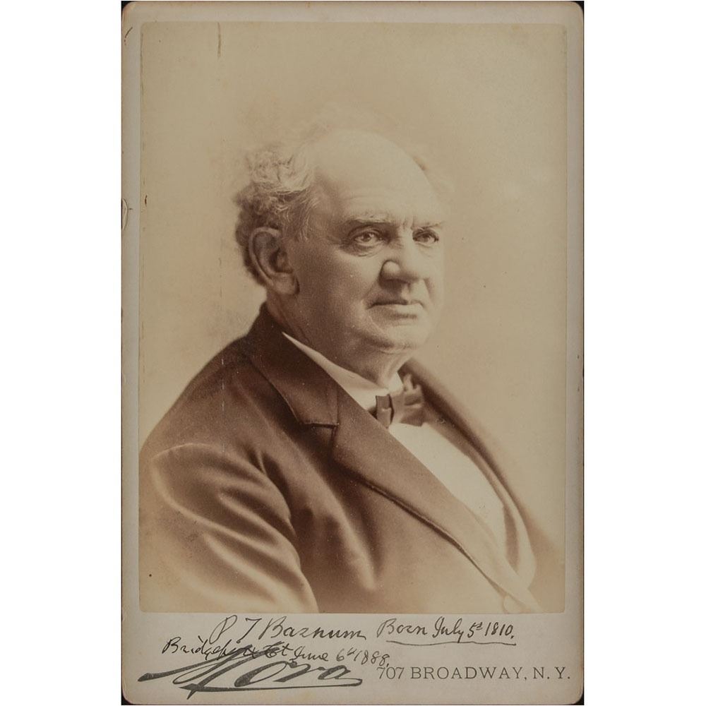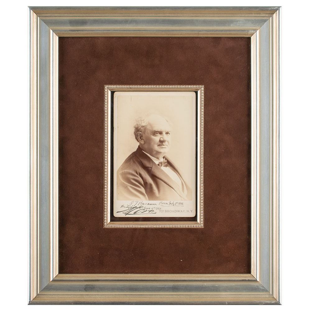 Seldom-seen 4.25 x 6.5 cabinet card portrait of Barnum in later age, signed in the lower border in black ink, "P. T. Barnum, Born July 5th 1810, Bridgeport, Ct, June 6th 1888." Archivally suede-matted and framed to an overall size of 13 x 15.25. In fine condition.
