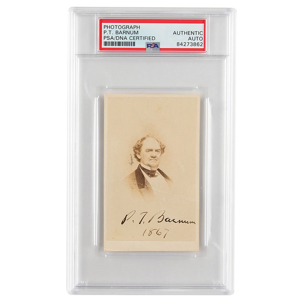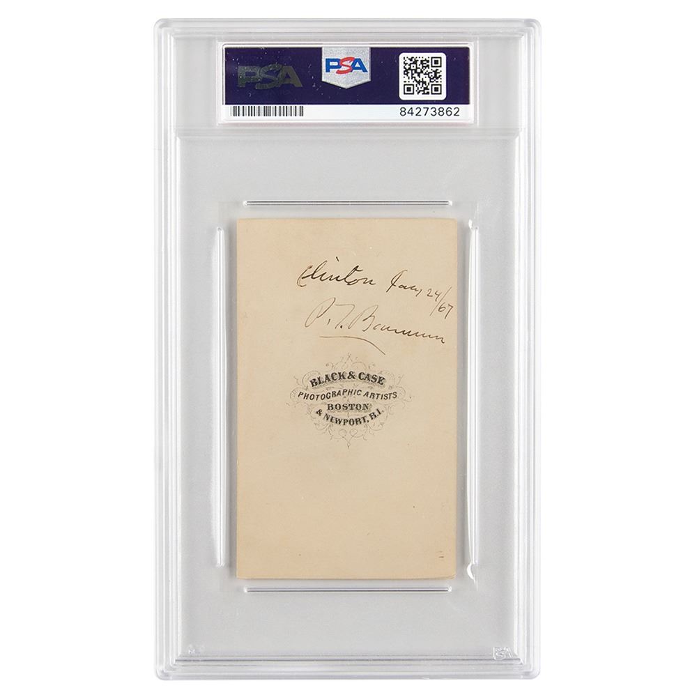 Uncommon 2.25 x 4 carte-de-visite photo of Barnum by Black & Case of Boston and Newport, signed below the image in ink, "P. T. Barnum, 1867," and also signed on the reverse, "Clinton, Jan'y 24/67, P. T. Barnum." In fine condition, with a light horizontal crease. A great portrait of the legendary showman boasting two fine autographs. Encapsulated in a PSA/DNA authentication holder.