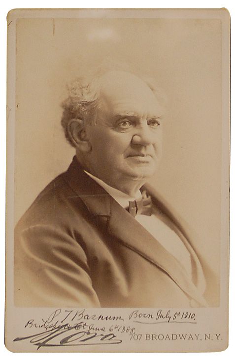 Vintage sepia 4.25 x 6.5 Mora Studios cabinet photo, signed in the lower border in black ink, “P. T. Barnum, Bridgeport, Ct. June 6th 1888,” with Barnum also adding, “Born July 5, 1810.” In fine condition, with small ding to left edge and a few trivial surface marks to image. After an 1881 merger with James Bailey and James L. Hutchinson, P.T. Barnum’s Greatest Show On Earth, And The Great London Circus, Sanger's Royal British Menagerie and The Grand International Allied Shows United, soon shortened to Barnum & London Circus. He and Bailey split up again in 1885, but came back together in 1888 with the Barnum & Bailey Greatest Show On Earth, later Barnum & Bailey Circus, which toured around the world. The show's primary attraction was Jumbo, an African elephant he purchased in 1882 from the London Zoo.