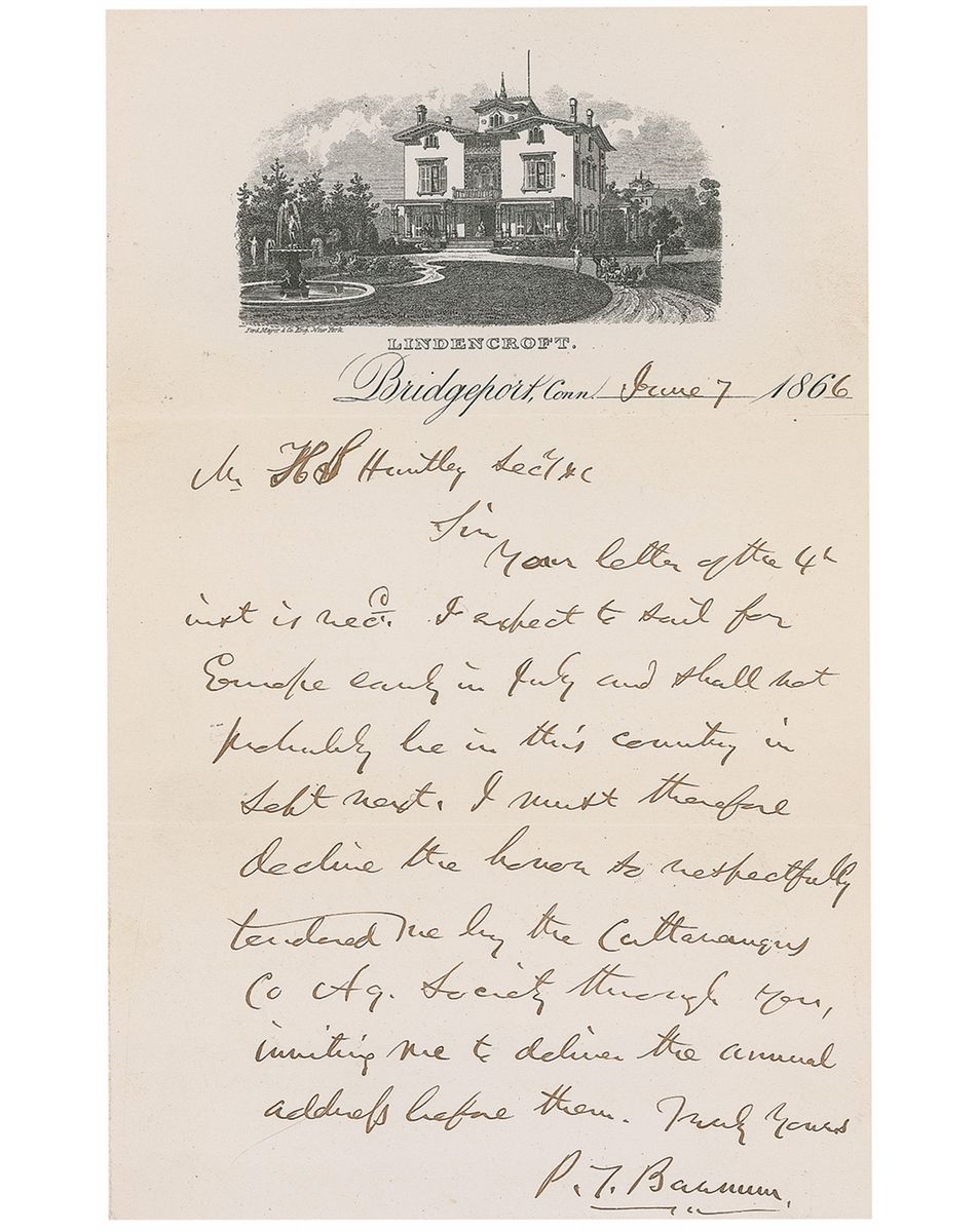 ALS, one page, 5.5 x 8.5, personal letterhead, June 7, 1866. A letter to H. S. Huntley on Barnum’s Lindencroft mansion letterhead, declining a speaking invitation. In part: “I expect to sail for Europe early in July and shall not probably be in this country in Sept next. I must therefore decline the honor so respectfully tendered me by the Cattaraugus Co Ag Society through you, inviting me to deliver the annual address before them.” In fine condition, with small separations along expected folds.