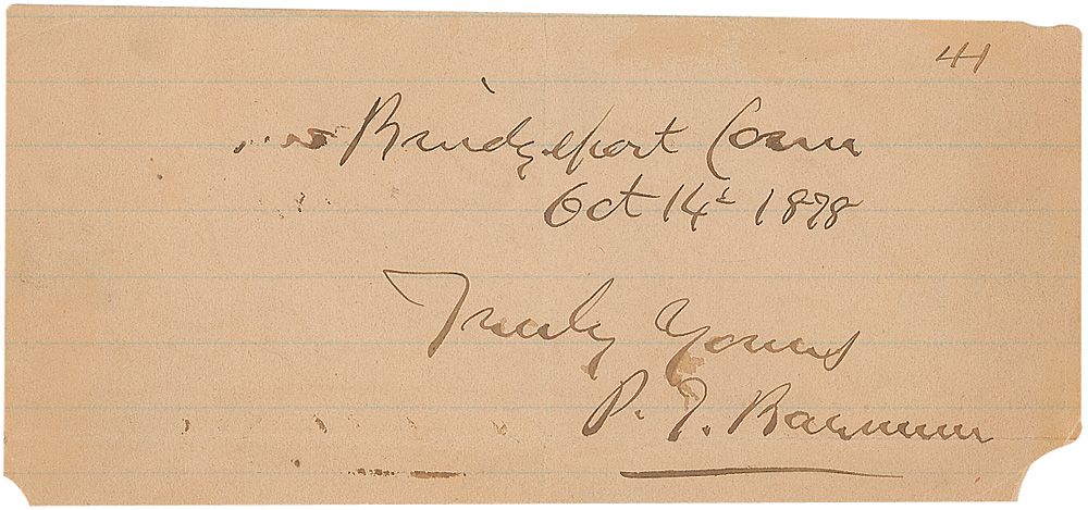 Ink signature, “Bridgeport, Conn. Oct. 14th, 1878, Truly Yours, P. T. Barnum,” on an off-white 5.5 x 2.5 lightly-lined sheet. In very good condition, with a central vertical fold, moderate overall toning, minimal paper loss to lower corners, and some light brushing and mirroring to the ink.
