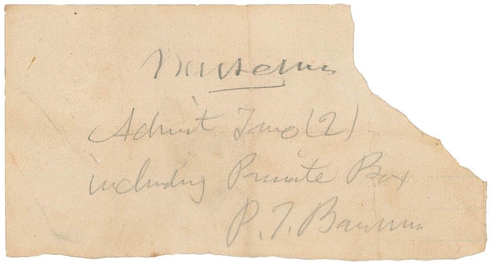 Handwritten museum pass, 5 x 2.5, filled out and signed in pencil by Barnum, “Museum, Admit Two (2), including Private Box, P. T. Barnum.” Intersecting folds and scattered creases affecting the signature, scattered toning and soiling, and heavy paper loss to upper right, otherwise very good condition.