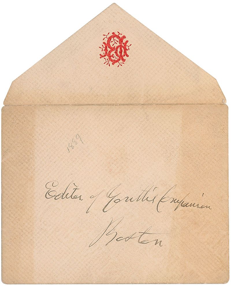 Personal stationery envelope with Barnum’s initials embossed on the flap, 4.5 x 3.5, unsigned but addressed in Barnum’s hand, “Editor of Youth’s Companion, Boston.” Blocks of toning to left and right borders, partially affecting the writing, and a light pencil notation indicating that it is from 1889, otherwise fine condition.
