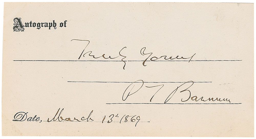 Ink signature, “Truly yours, P. T. Barnum,” on an off-white 5 x 2.75 card, dated March 13, 1869. In fine condition.