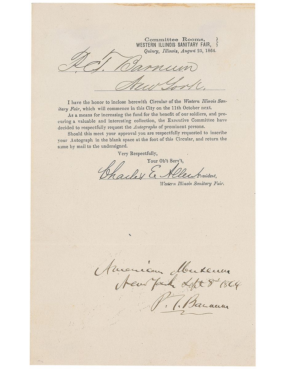 Legendary American showman, scam artist, and entertainer (1810–1891) known for promoting hoaxes and founding the Ringling Bros. and Barnum & Bailey Circus. Civil War–dated DS, signed “American Museum, New York, Sept. 8th 1864, P. T. Barnum,” one page, 5 x 8, August 25, 1864. Barnum signs at the conclusion of an autograph request document issued by the Western Illinois Sanitary Fair Committee. In part: “As a means for increasing the fund for the benefit of our soldiers, and procuring a valuable and interesting collection, the Executive Committee have decided to respectfully request the Autographs of prominent persons.” In fine condition.