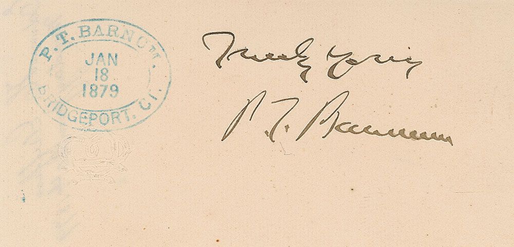 Ink signature, “Truly yours, P. T. Barnum,” on an off-white 4.5 x 2.25 embossed slip, with a P. T. Barnum stamp dated January 18, 1879, along the left edge. In fine condition.