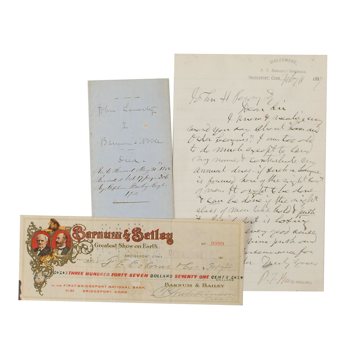 Three items: ALS, one page, lightly-lined, 5.75 x 9, personal letterhead, February 11, 1887. Letter to John H. Perry. In part: “I know and realize every word you say about ‘Law and Order Leagues.’ I am too old to do much except to lend my name, & contribute my annual dues—if such a League is formed here of the right sort of me, it ought to be done & can be done.” Also includes a colorfully illustrated Barnum & Bailey business check signed by C. R. Hutchinson, 8.5 x 3.25, payable to J. E. Osborne & Co. for $347.71, stamp-dated December 10, 1918; and a transaction land transaction deed between Barnum and John Loverty for the sale of a tract of land in Bridgeport, May 20, 1852, signed by some witnesses and representatives but not Barnum. In overall fine condition.