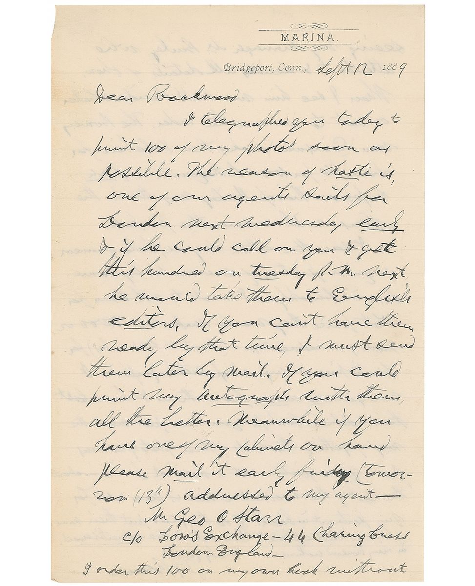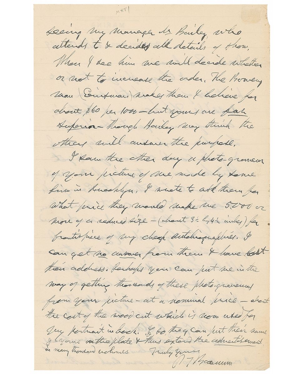 ALS, one page both sides, 5.75 x 9, Marina, Bridgeport, CT letterhead, September 12, 1889. Letter to Rockwood. In part: “I telegraphed you today to print 100 of my photos soon as possible. The reason of haste is, one of our agents sails for Dresden next Wednesday early & if he could call on you & get this hundred on Tuesday P.M. next he would take them to English editors. If you can’t have them ready by that time, I must send them later by mail. If you could print my autograph with them, all the better. Meanwhile if you have one of my cabinets on hand please mail it early Friday…I order this 100 on my own back without seeing my manager Mr Bailey, who attends to & decides all details of show. When I see him we will decide whether or not to increase the order. The Bowery man (Eisenmann) makes them I believe for about $60 per 1000—but yours are far superior—though Bailey may think the other will answer the purpose. I saw the other day a photo-graveur of your picture of me made by some firm in Brooklyn. I wrote to ask them for what price they would make me 5,000 or more of a reduced size—(about 3.5 by 4.5 inches) for frontispiece of my cheap autobiographies. I can get no answer from them & have lost their address. Perhaps you can put me in the way of getting thousands of these photo-graveurs from your picture—at a nominal price—about the cost of the woodcut which is now used for my portrait in book. If so, they can put their name & yours on the plate & thus extend the advertisement in many thousand volumes.” In fine condition, with light toning to the left border, trivial paper loss to the upper left corner, and a spot of adhesive remnants to the reverse upper right corner. Accompanied by an original unsigned carte-de-visite portrait of Barnum by an anonymous studio. Eisenmann’s most notable work consisted of portraits of human oddities from the Barnum and Bailey circus, including Jojo the Dog-faced Boy, Siamese twins Chang and Eng, and Tom Thumb. Because of this relationship, it is surprising to see that Barnum preferred Rockwood. A letter that reveals some strife in the relationship between Barnum and Bailey, and contains truly spectacular photographic content.