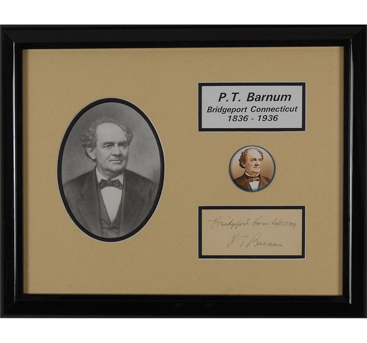 Ink signature, “Bridgeport, Conn, Sept. 28, 1889, P. T. Barnum,” on an off-white 4 x 2 slip. Nicely double-matted and framed with two images of Barnum to an overall size of 14.75 x 12. In fine condition.