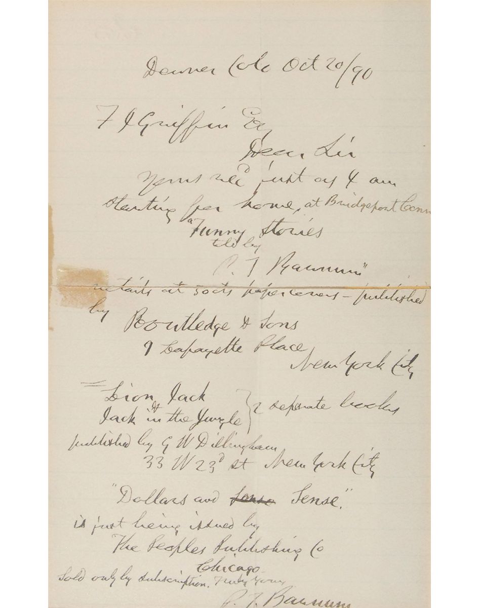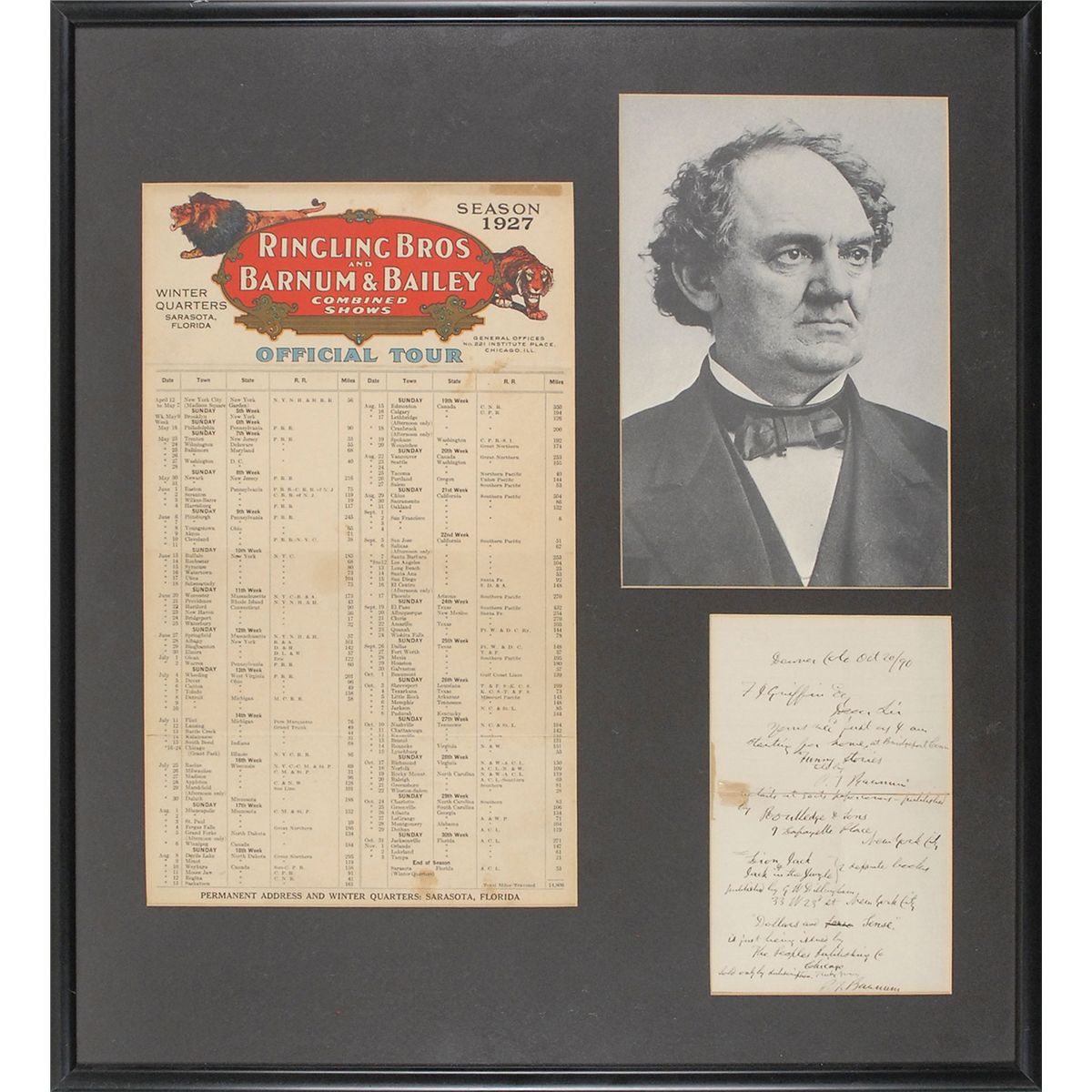 ALS, one page, lightly-lined, 4.75 x 7.5, October 20, 1890. Letter to F. J. Griffin. In full: “Yours recd just at 4 am starting for home at Bridgeport Conn. Funny Stories told by P. T. Barnum retails at 50 cts paper covers published by Boutledge & Sons, 7 Lafayette Place, New York City. Lion Jack & Jack in the Jungle-2 separate books published by G. W. Billingham 33 W 23d St. New York City. ‘Dollars and Sense’ is just being issued by the Peoples Publishing Co, Chicago, sold only by subscription.” Matted and framed with a portrait of Barnum and a colorful 1927 Ringling Bros and Barnum & Bailey tour schedule to an overall size of 20 x 22. In fine condition, with central horizontal and vertical folds, one through a single letter of signature, and some light toning to left side from old tape.