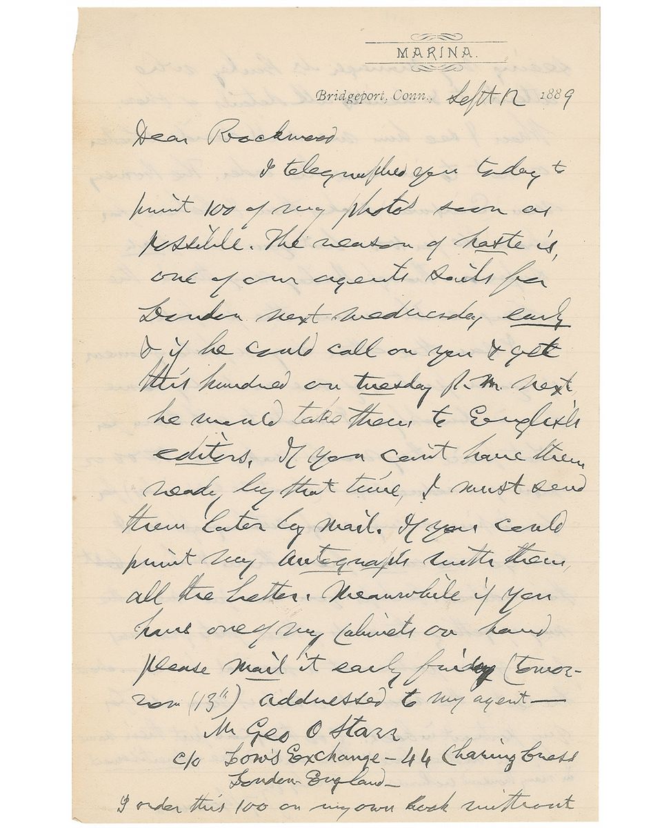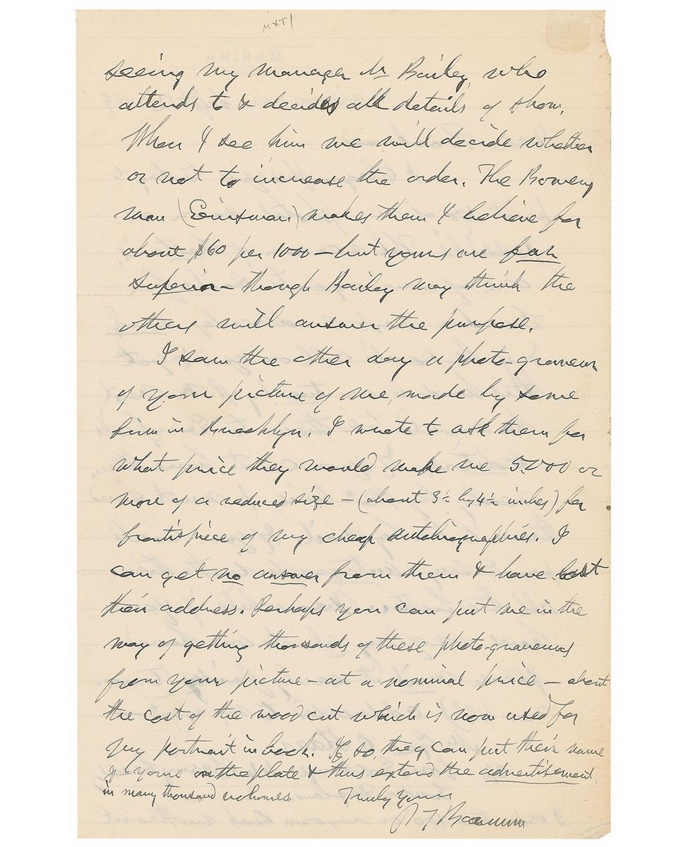 ALS, one page both sides, 5.75 x 9, Marina, Bridgeport, CT, letterhead, September 12, 1889. Letter to Rockwood. In part: “I telegraphed you today to print 100 of my photos soon as possible. The reason of haste is, one of our agents sails for Dresden next Wednesday early & if he could call on you & get this hundred on Tuesday P.M. next he would take them to English editors. If you can’t have them ready by that time, I must send them later by mail. If you could print my autograph with them, all the better. Meanwhile if you have one of my cabinets on hand please mail it early Friday…I order this 100 on my own back without seeing my manager Mr Bailey, who attends to & decides all details of show. When I see him we will decide whether or not to increase the order. The Bowery man (Eisenmann) makes them I believe for about $60 per 1000—but yours are far superior—though Bailey may think the other will answer the purpose. I saw the other day a photo-graveur of your picture of me made by some firm in Brooklyn. I wrote to ask them for what price they would make me 5,000 or more of a reduced size—(about 3.5 by 4.5 inches) for frontispiece of my cheap autobiographies. I can get no answer from them & have lost their address. Perhaps you can put me in the way of getting thousands of these photo-graveurs from your picture—at a nominal price—about the cost of the woodcut which is now used for my portrait in book. If so, they can put their name & yours on the plate & thus extend the advertisement in many thousand volumes.” In fine condition, with light toning to the left border, trivial paper loss to the upper left corner, and a spot of adhesive remnants to the reverse upper right corner. Accompanied by an original unsigned carte-de-visite portrait of Barnum by an anonymous studio. Eisenmann’s most notable work consisted of portraits of human oddities from the Barnum and Bailey circus, including Jojo the Dog-faced Boy, Siamese twins Chang and Eng, and Tom Thumb. Because of this relationship, it is surprising to see that Barnum preferred Rockwood. A letter that reveals some strife in the relationship between Barnum and Bailey, and contains truly spectacular photographic content.