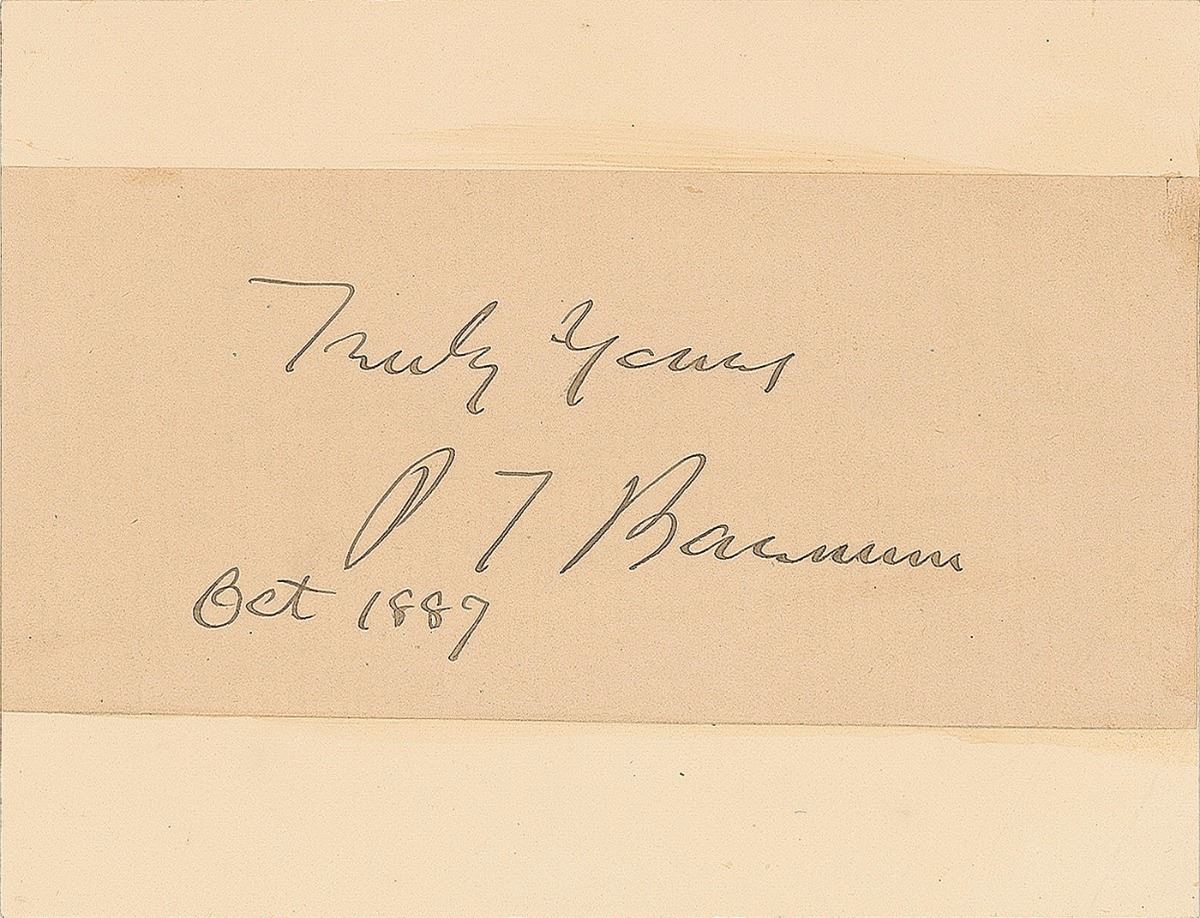 Attractive ink signature, “Truly yours, P. T. Barnum, Oct. 1887,” on an off-white 4.5 x 2 slip affixed to a slightly larger card. In fine condition.