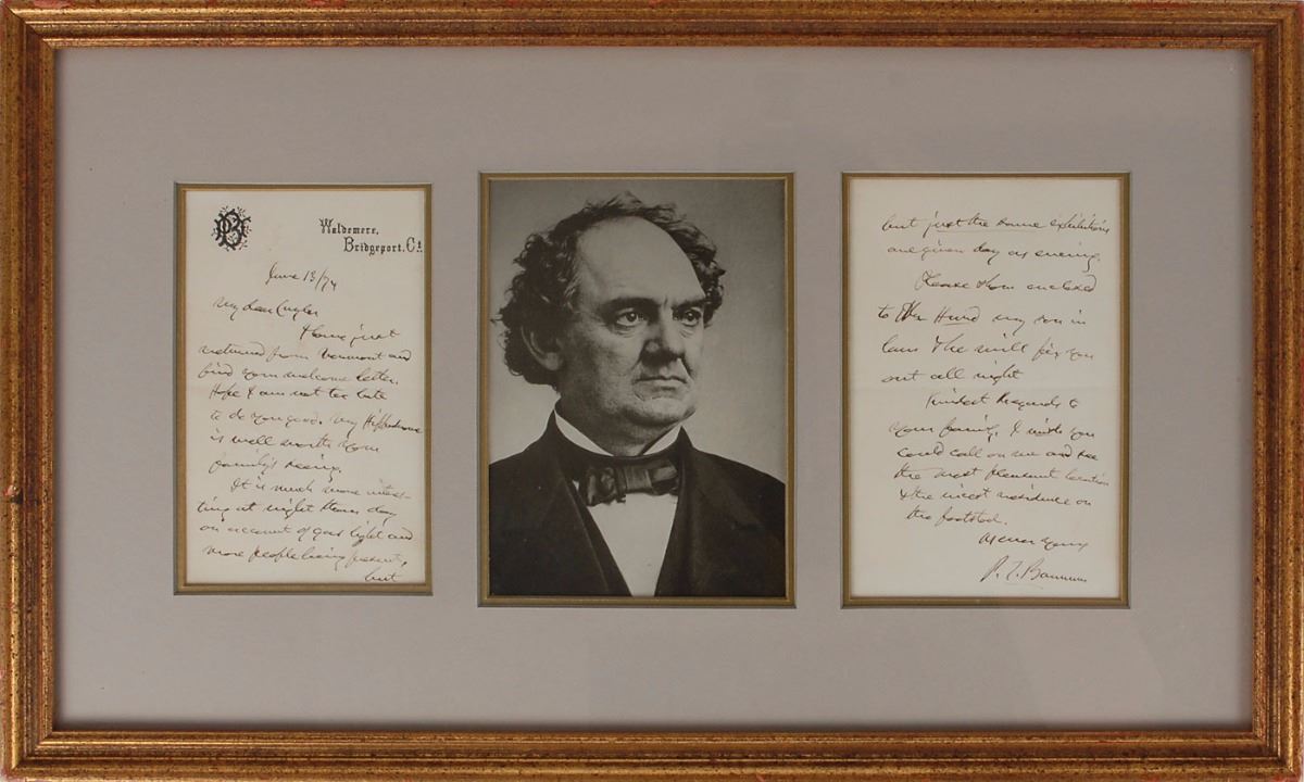 ALS, two pages, 3.75 x 6.75, personal monogrammed letterhead, June 13, 1874. Letter to “My dear Cuyler,” in full: “I have just returned from Vermont and find your welcome letter. Hope I am not too late to do you good. My Hippodrome is well worth your family’s seeing. It is much more interesting at night than day on account of gas light and more people being present, but just the same exhibitions are given day as evening. Please show enclosed to Mr [Samuel Henry] Hurd my son in law & he will fix you out all right. Kindest Regards to your family. I wish you could call on me and see the most pleasant location & the nicest residence on the footstool.” Double-matted and framed with an image of Barnum to an overall size of 20.75 x 12.5. In fine condition.