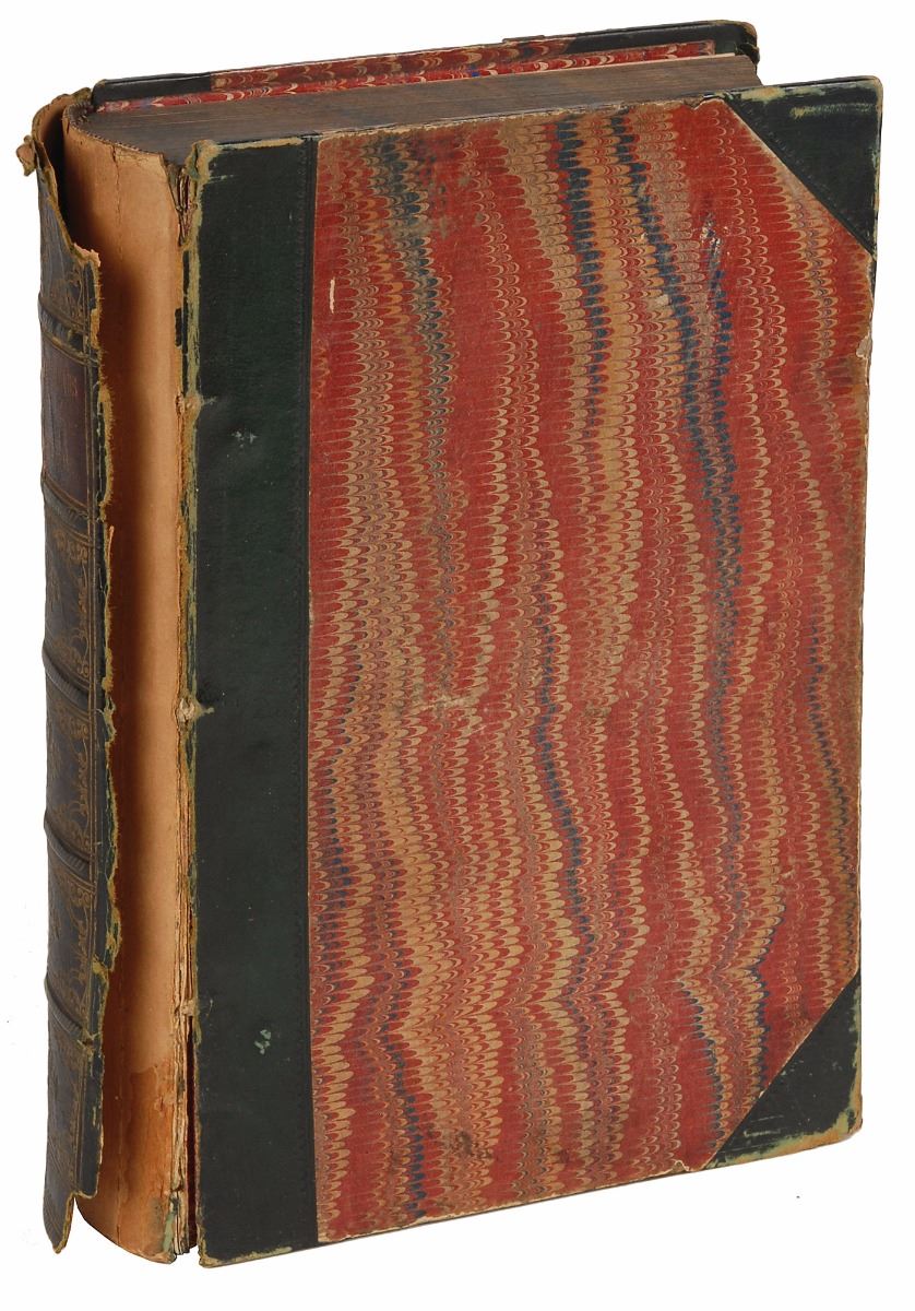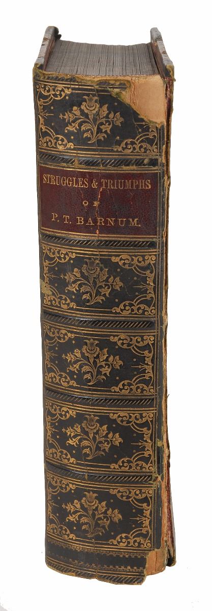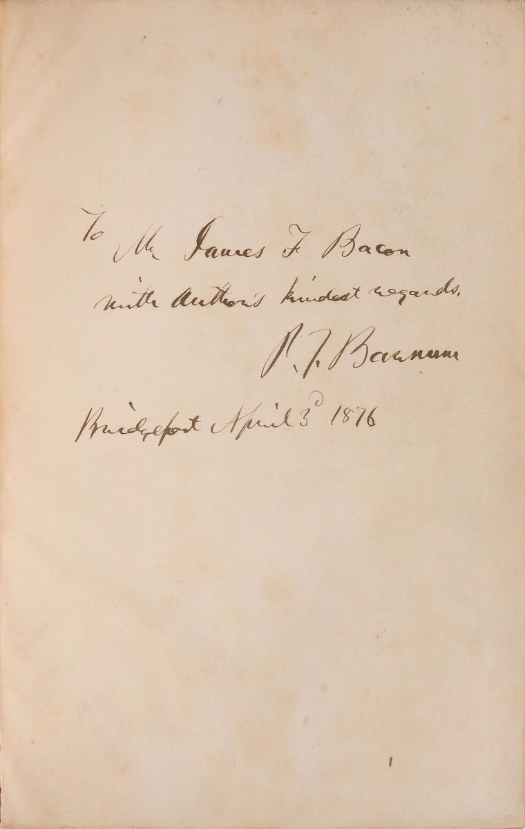 Signed book: Struggles and Triumphs: or, Forty Years' Recollections of P. T. Barnum. Author's edition, later printing. Buffalo: Warren, Johnson & Co., 1874. Hardcover, 6.5 x 9, 870 pages. Signed and inscribed on a free end page in black ink, "To Mr. James F. Bacon, with author's kindest regards, P. T. Barnum, Bridgeport, April 3d 1876." Autographic condition: very good, with light rippling and soiling to the signed page. Book condition: G/None, with a cracked front joint, soiling throughout, and partially detached and torn spine (though binding remains tight). Pre-certified PSA/DNA.