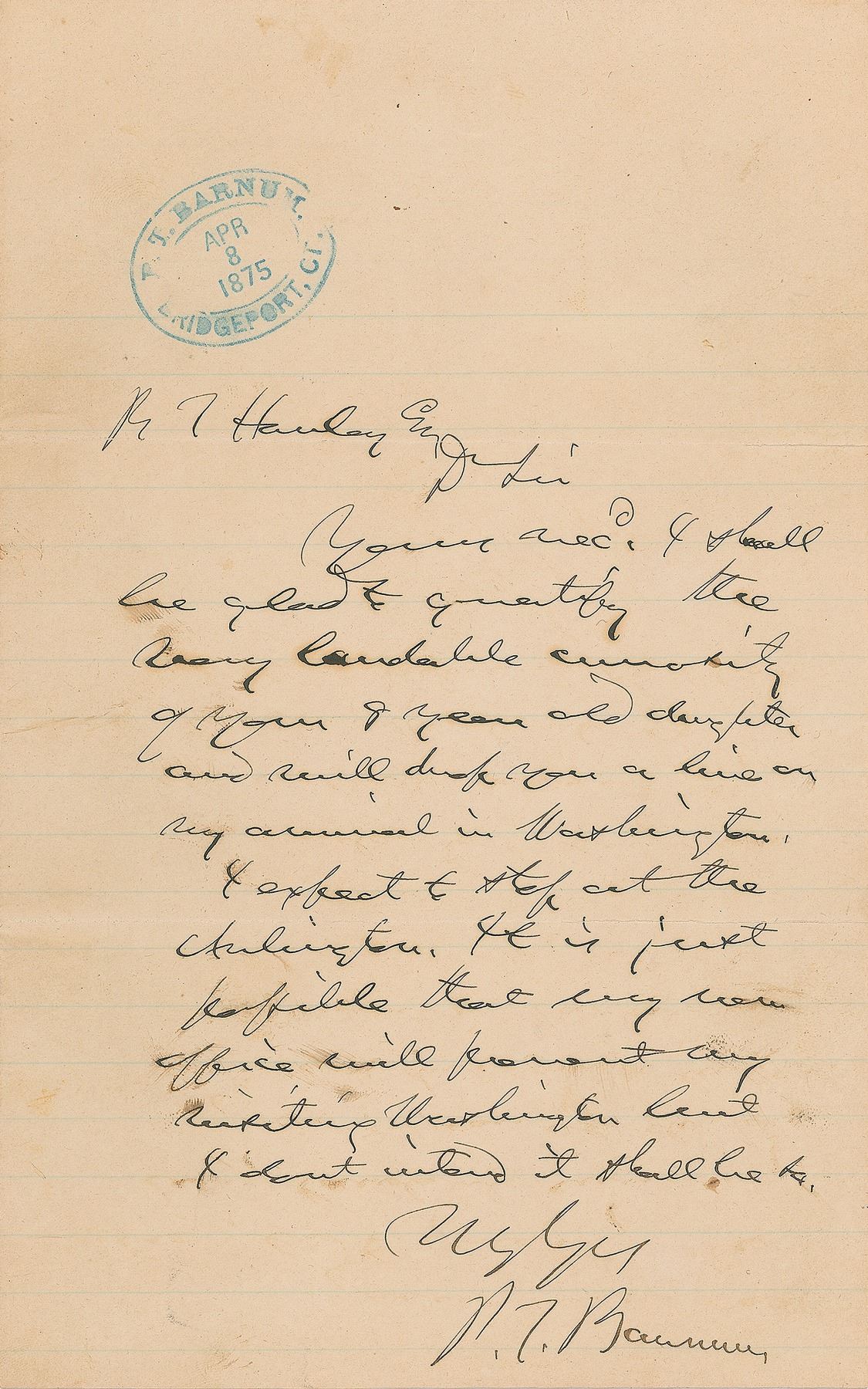 ALS, one page, 5 x 8, postmarked April 8, 1875. Letter to R. T. Hawley, in full: "Yours rec'd. I shall be glad to gratify the very laudable curiosity of your 8 year old daughter and will drop you a line on my arrival in Washington. I expect to stop at the Arlington. It is just possible that my new office will prevent my visiting Washington but I don't intend it shall be." In fine condition, with splitting to the ends of the horizontal folds.