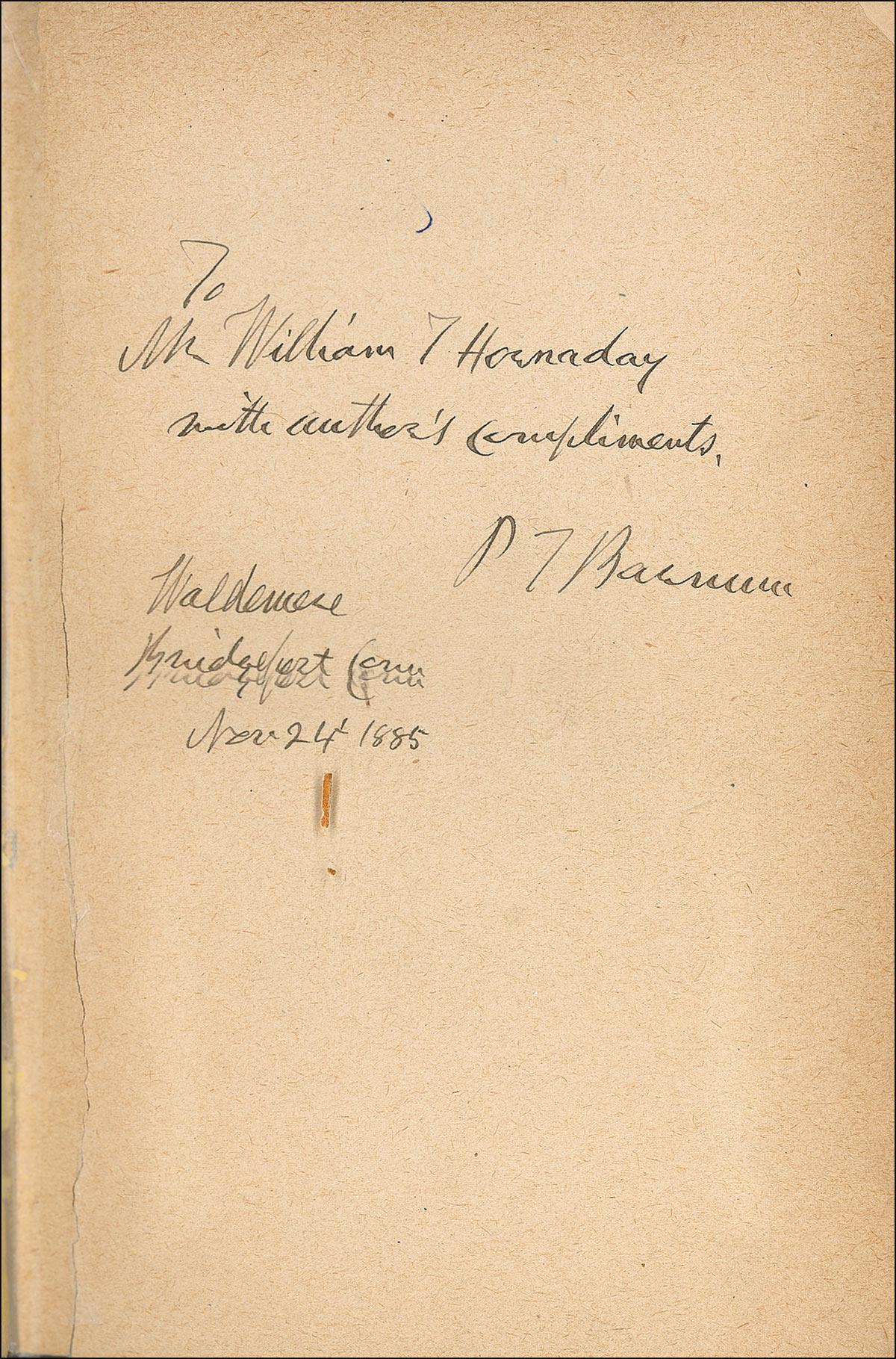 Signed book: Life of P. T. Barnum. Later printing. NY: Hurst & Co., 1885. Hardcover, 5.25 x 7.5, 357 pages. Signed and inscribed on the second free end page, “To Mr. William T. Hornaday, with author’s compliments, P. T. Barnum, Waldemere, Bridgeport, Conn. Nov. 24, 1885.” In good to very good condition, with inside front cover chipped and stained from bookplate removal, surface wear and rubbing to covers, heavy sunning and wear to slightly loose spine, tape repair to torn inside edge of signed page, and several lines of publisher’s information blacked out, as well as felt tip marks to bottom of pages. All writing is bold and unaffected by any of the book’s flaws. Pre-certified PSA/DNA and RRAuction COA.