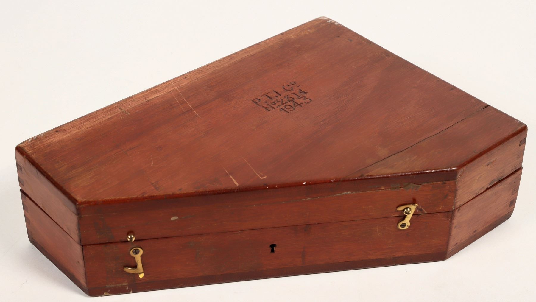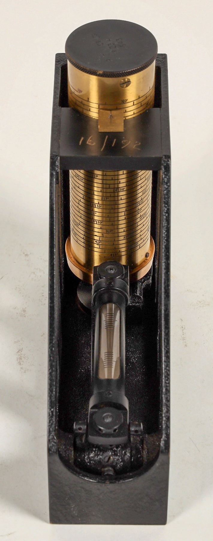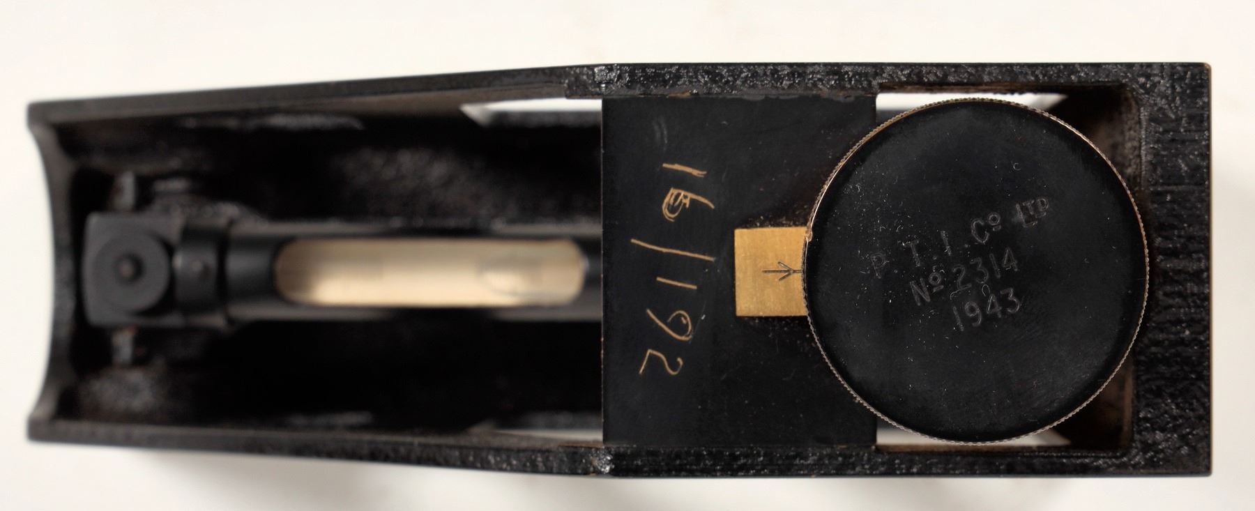 This is a clinometer made by P.T.I. Co. dated 1943 S/N 2314 with matching S/N wood case. Used in artillery applications. In excellent condition with working spirit level. Please see photos for details.