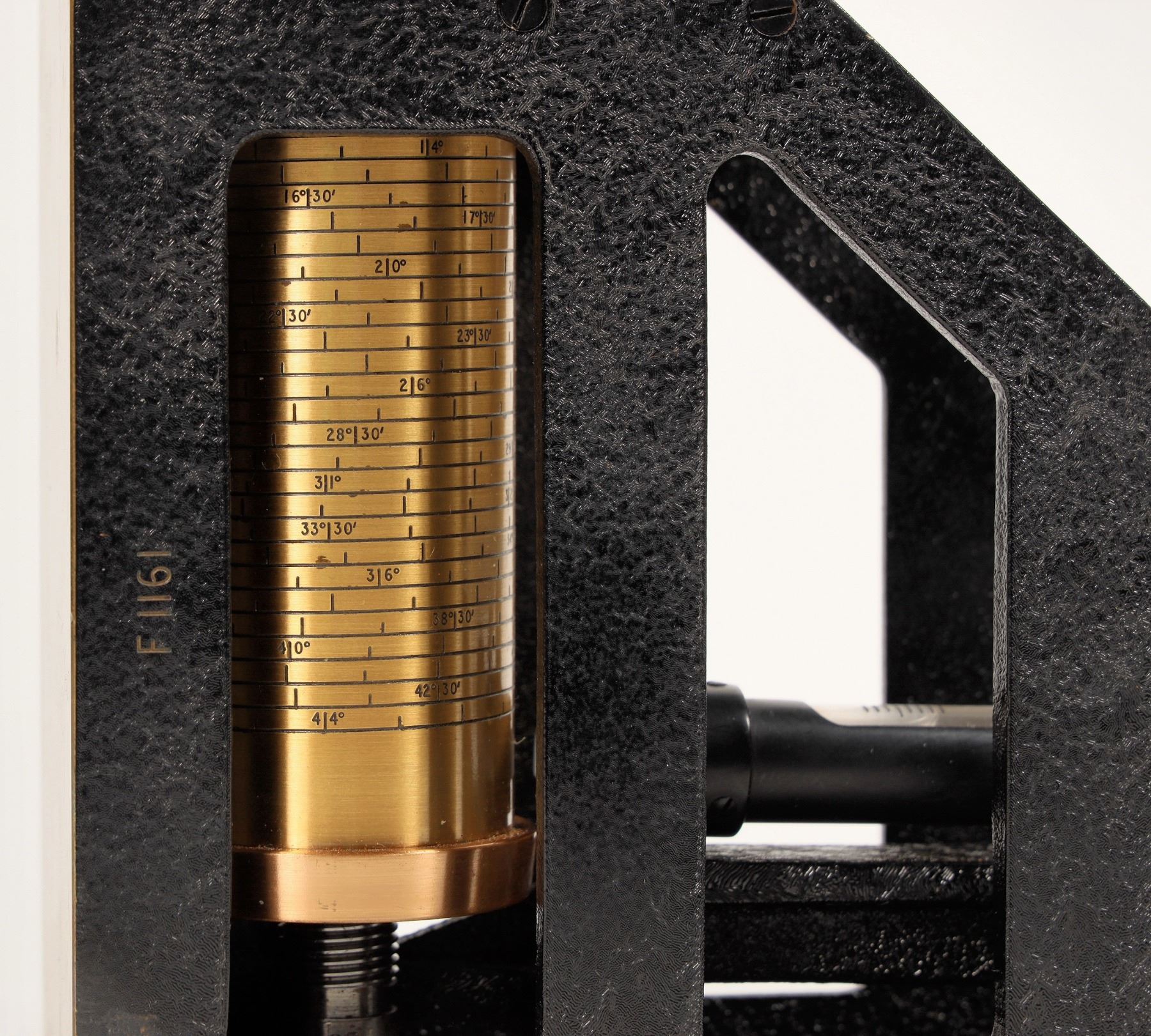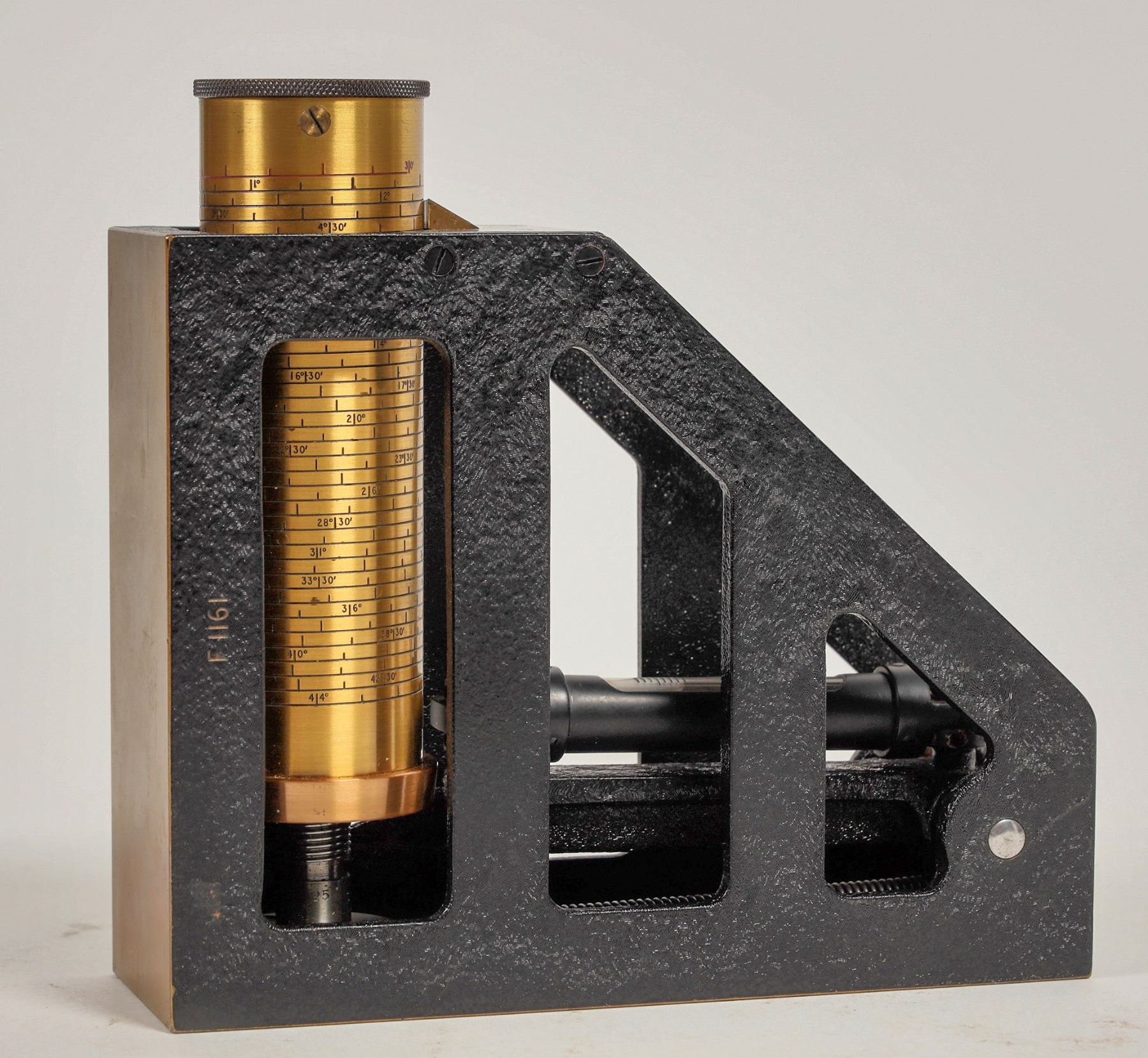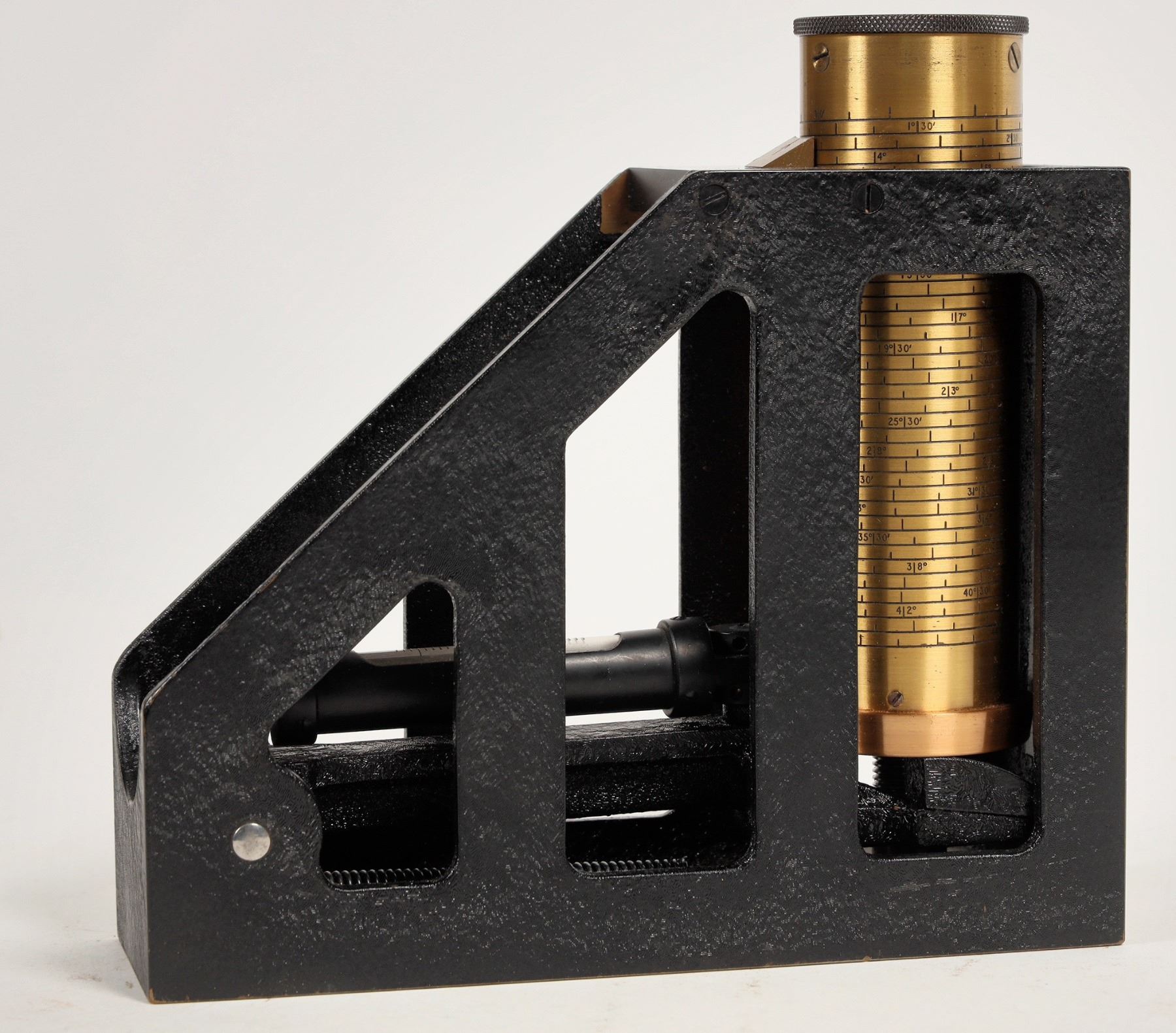 This is a clinometer made by P.T.I. Co. dated 1943 S/N 2314 with matching S/N wood case. Used in artillery applications. In excellent condition with working spirit level. Please see photos for details.
