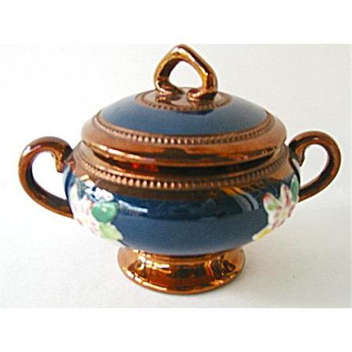 Antique copper lustre sugar bowl that has a wonderful floral relief of flowers. Blue band on this sugar that is marked P.V.France Sarrequemines. Some very slight glaze crazing on the bottom. This is the premier company that produced choice majolica. Antique from early 1900s.