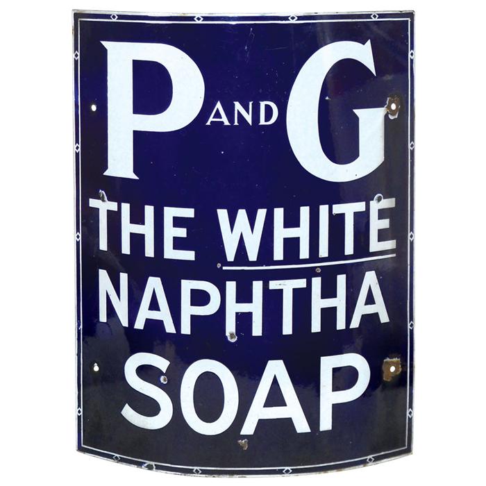 P and G Naphtha Soap curved porcelain sign, cobalt blue & white, VG cond w/some smaller chips, 24"H x 18.75"W.
