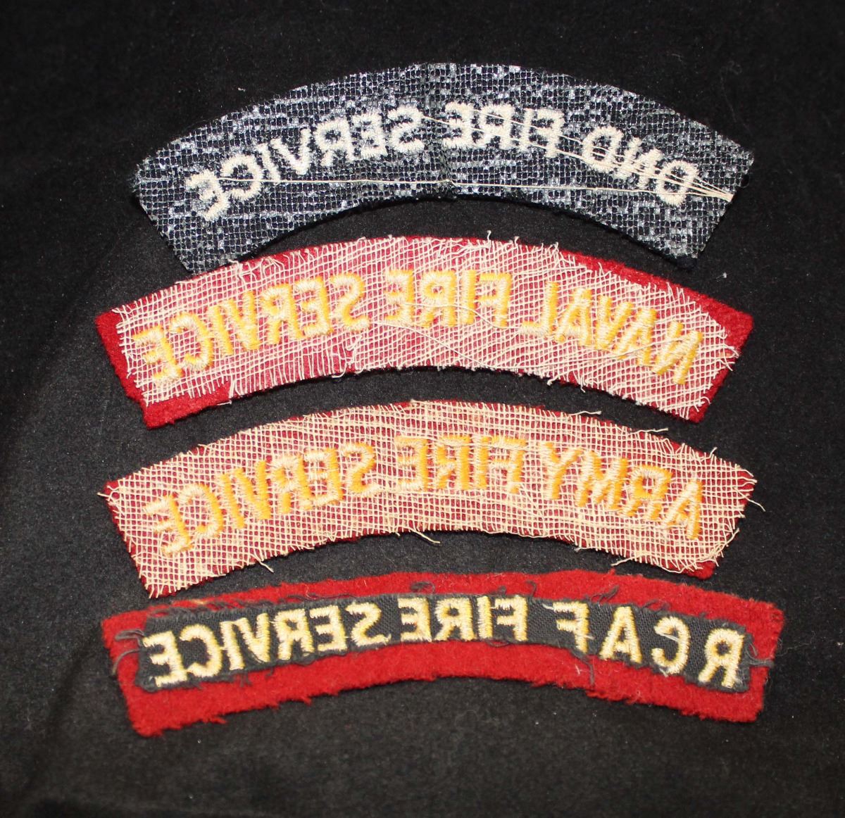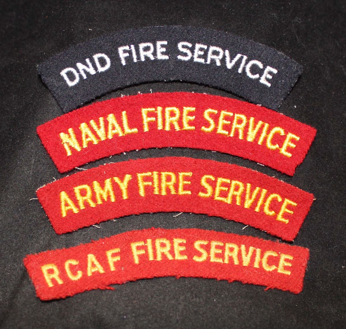 1 - words, NAVAL FIRE SERVICE, curved up, yellow on red, white gauze backing, excellent. 1 - ARMY FIRE SERVICE, curved up, dark yellow on red, white gauze backing. 1 - RCAF FIRE SERVICE, curved up, age dulled, black cloth backing. 1 - DND FIRE SERVICE, curved up, white on black, white gauze backing. Nice lot. Lot of 4.