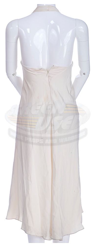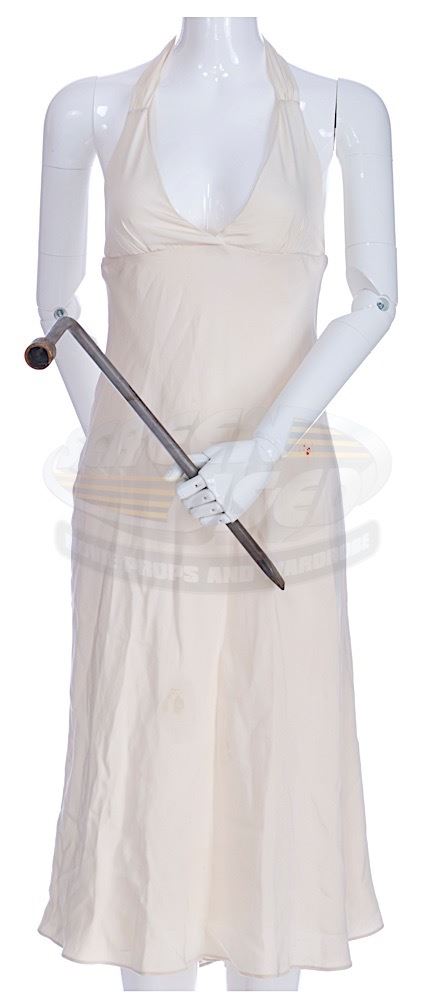 (Summit Entertainment, 2007) This dress and prop tire iron were acquired by the production for use by Rachel Nichols as "Angela". The dress is made of silk and shows signs of wear, with studio applied blood still present. Dress size is unknown. The tire iron is made of rubber for use during stunts and measures 19.5" in length.