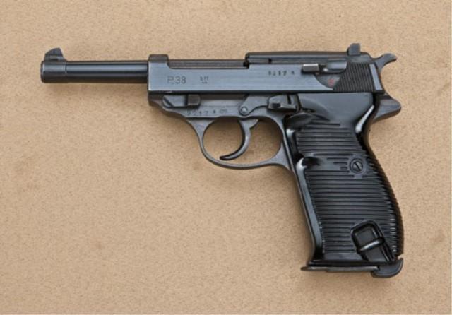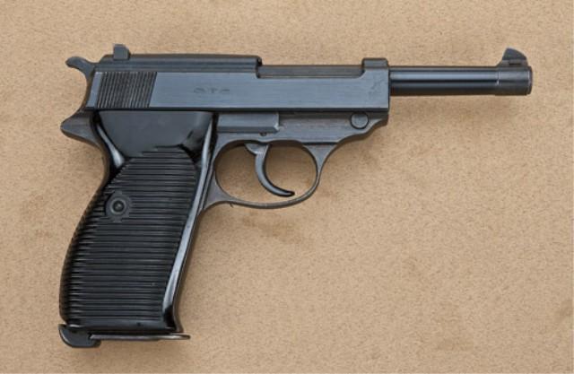 P38 9mm German-issue semi-automatic pistol, BYF maker marked, 1944 dated, serial #9217S. The pistol remains in near fine original condition with 92-96% original blue, some slight losses at the high points and edges, a couple of minor scratches, near excellent grips, full complement of Nazi proofs, excellent bore, correct late war magazine. From the Bernard Braverman Estate. Est: $400 - $800