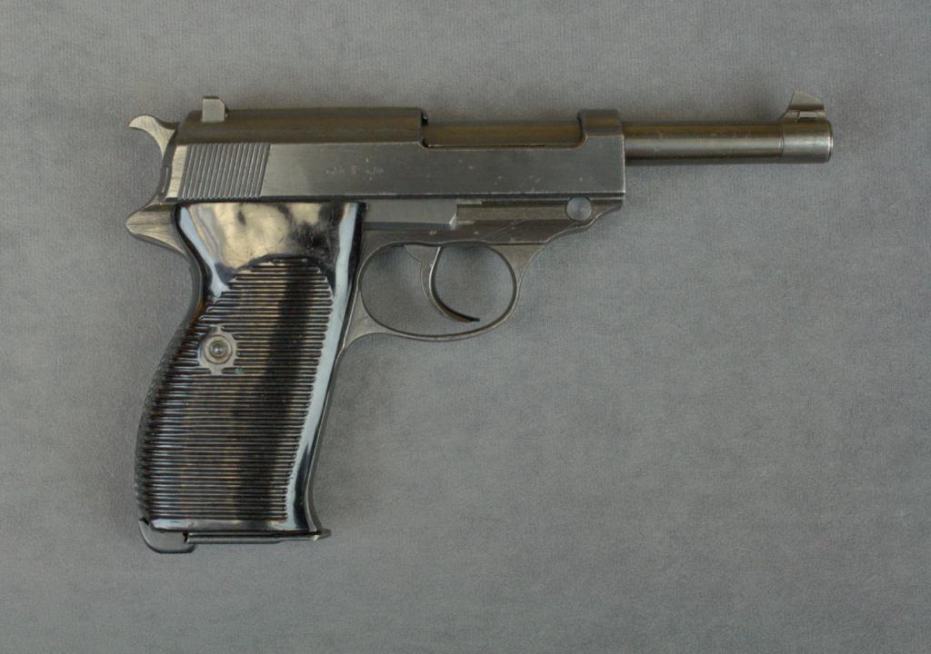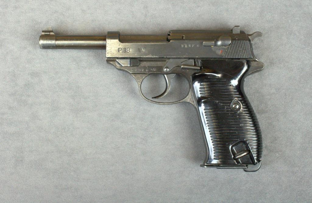 P38 German military issue, 9mm caliber, semi-automatic pistol by BYF, dated 1944. Very good overall condition, serial #3187Z. The pistol shows 90-95% wartime blue finish, some pitting and erosion on the left side ofthe slide and muzzle and a few other small areas of pinprick pitting. The markings are good and sharp, the pistol shows a full complement of Nazi proofs. The grips are good to very good. The bore is excellent. Wartime magazine is included. From the Bernard Braverman Estate. Est: $400 - $800
