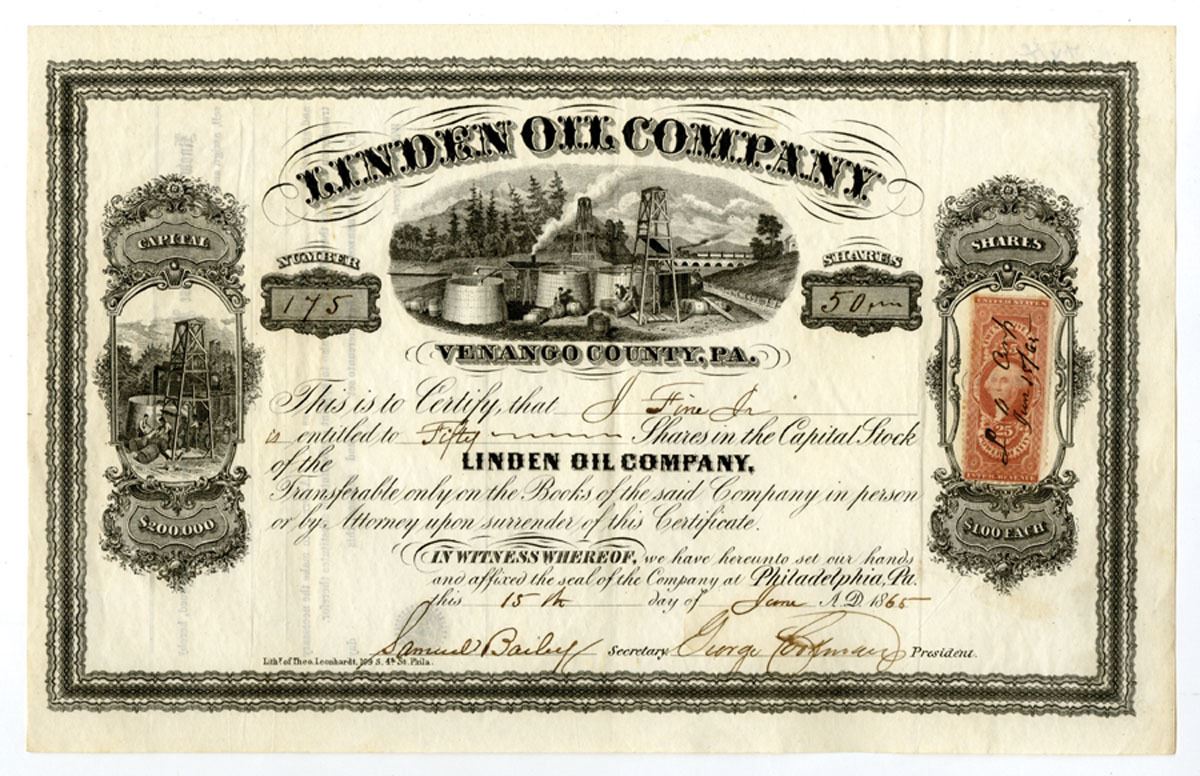 Venango County, Pennsylvania (Offices in Philadelphia), 1865. 50 Shares Capital Stock I/U Certificate, Black print with black border, Oil and oil storage related vignettes at top and along left side, S/N 175, Revenue stamp at right side, VF to XF condition with stains.