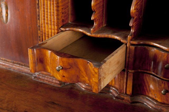 A Pennsylvania or Maryland slant front desk. c.1800. Tiger maple veneer with yellow pine and oak as secondary. Slant top opens to reveal interior drawers and pigeon holes. Central prospect door is inlaid with an American eagle, flanked by two vertical document drawers with column fronts. Raised on bracket feet. (Replaced) 45?h x 42?w x 19 ??d.