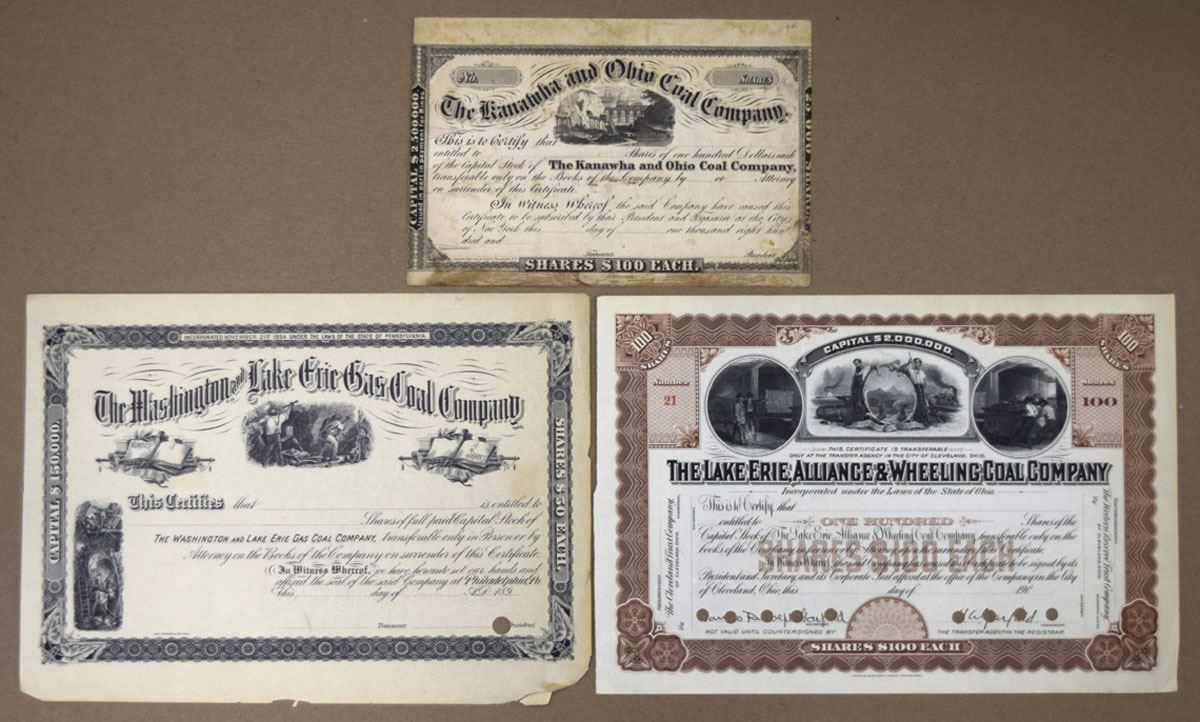 Pennsylvania & Ohio, ND (ca.1870s to 1900s). Lot of 3 Stock Certificates, Includes: Kanawha and Ohio Coal Co. Proof Stock Certificate; Washington and Lake Erie Gas Coal Co. Specimen Stock Certificate; Lake Erie, Alliance & Wheeling Coal Co. Cancelled Stock Certificate. Certificates range from Fine to VF+ condition. (3). Sold "AS IS" no returns accepted.